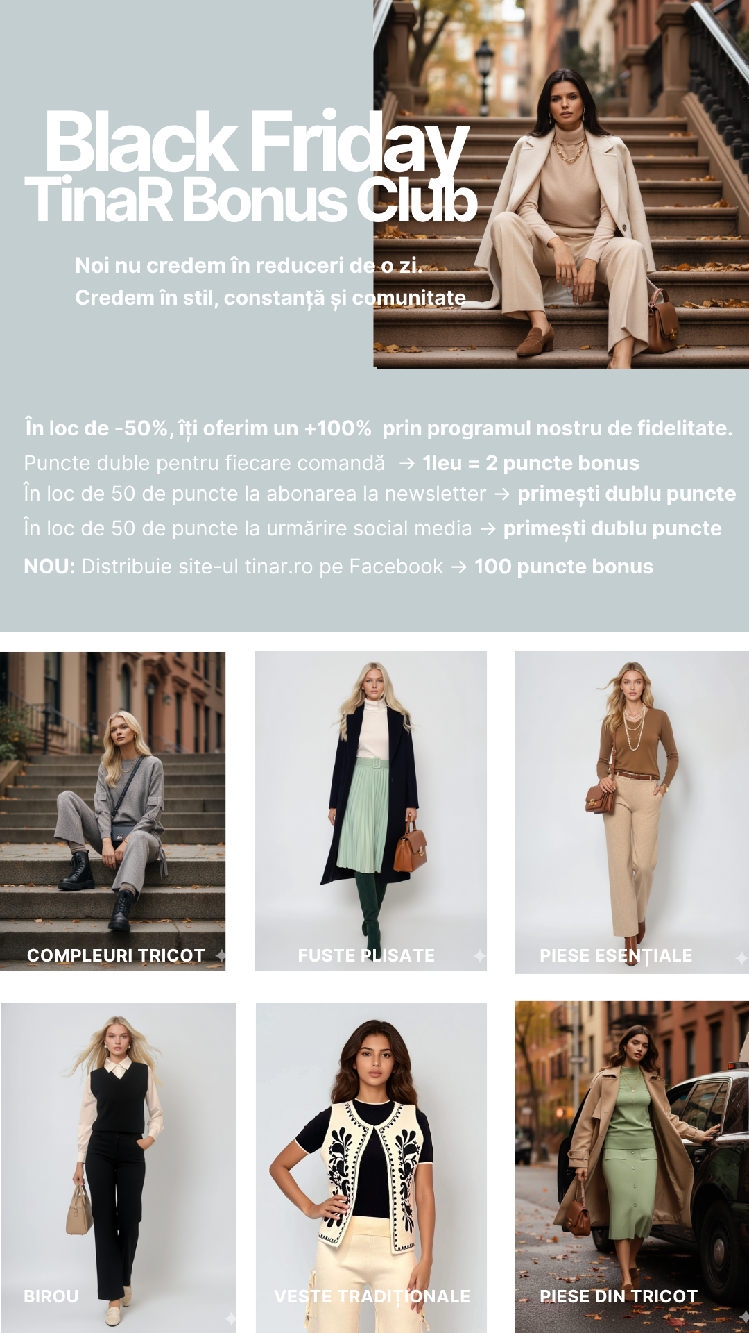 TinaR se mândrește cu cele 6 magazine în care aduce zilnic selecții curate și atent selectate de produse. Stocurile sunt limitate, dar varietatea este impresionantă, oferind opțiuni potrivite pentru orice vârstă și siluetă.