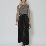 Bluza din voal gri, cu mâneci lungi din tulle cu buline polka dots, combină eleganța cu un aer jucăuș. Nasturii și eșarfele subtiri de la gât adaugă versatilitate, fiind potrivită pentru ținute cu fuste din tulle sau blugi, ideale pentru o seară relaxată dar stilată.
