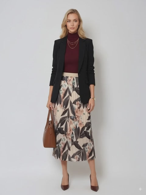 Fustă lungă plisată cu bandă elastică în talie negru-alb este alegerea perfectă pentru un look monocrom elegant cu accente florale. Imprimeul contrastant adaugă personalitate, iar voalul ușor și talia decorativă cu irizații aurii transformă această piesă într-o variantă modernă și versatilă pentru zi sau seară.