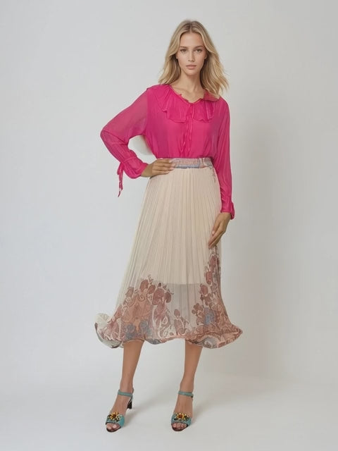 Fustă lungă albastră plisată, decorată cu print floral elegant și crinolină fluidă la bază, care oferă volum și fluiditate. Talie elastică pentru o potrivire confortabilă, ideală pentru evenimente și ocazii speciale.