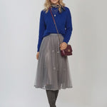 Fustă midi din tulle cu fundițe și aspect satinat gri, care combină textura fină și luciul discret pentru un stil rafinat și elegant. Ideală pentru ținute de evenimente sau ocazii speciale, oferind confort și feminitate.