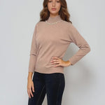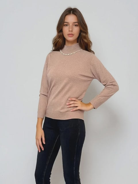 Pulover cu colier decorativ din perle și paiete beige se remarcă prin detaliul elegant din zona gâtului, ce imită perfect un colier rafinat. Nuanța caldă de beige și textura tricotată adaugă un plus de rafinament oricărei ținute.