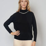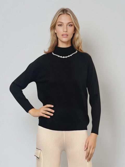 Pulover cu colier decorativ din perle și paiete negru se remarcă prin contrastul spectaculos dintre materialul tricotat și aplicația strălucitoare din jurul gâtului. Acest colier integrat din perle și paiete transformă puloverul într-o piesă specială, ușor de purtat în contexte elegante sau casual.