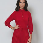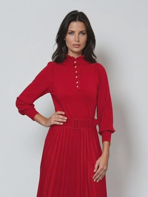 Pulover cu mâneci bufante și guler încrețit roșu este o piesă statement, plină de personalitate. Gulerul decorat cu nasturi și croiala feminină creează un look romantic și îndrăzneț.