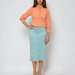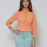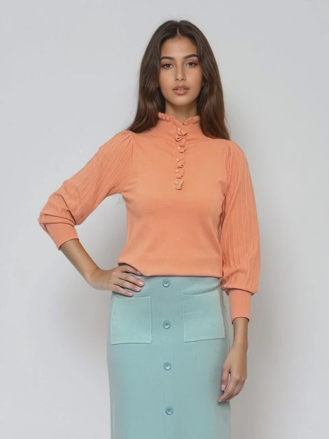 Pulover cu mâneci bufante și guler încrețit somon este alegerea feminină și delicată pentru sezonul rece. Detaliile rafinate precum gulerul decorat cu nasturi oferă un aer romantic, ideal pentru ținute elegante de zi.