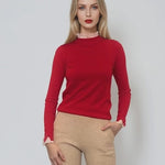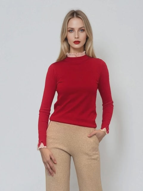 Pulover cu volan plisat la mânecă și gât roșu, o alegere vibrantă pentru un look plin de energie. Volanele fine adaugă un plus de feminitate, iar croiala lejeră îl face potrivit pentru birou sau plimbări relaxante.