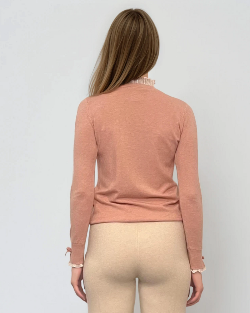Pulover cu volan plisat la mânecă și gât roz, cu un design delicat și romantic. Ideal pentru a adăuga feminitate unei ținute office sau casual. Textura moale și croiala lejeră îl transformă într-o piesă confortabilă și elegantă.