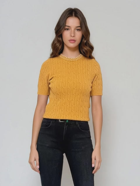 Pulover tricotat cu mânecă scurtă și perle galben aduce o explozie de culoare în garderoba ta, fiind perfect pentru zilele luminoase. Perlele discrete oferă un contrast elegant, transformând o piesă casual într-una rafinată.