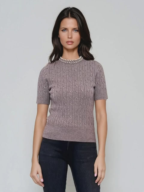 Pulover tricotat cu mânecă scurtă și perle gri este o piesă esențială pentru o garderobă minimalistă și rafinată. Nuanta neutră se potrivește ușor cu diverse combinații, în timp ce detaliile cu perle adaugă feminitate.