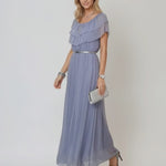 Volanele delicate de la nivelul umerilor adaugă un accent modern, iar croiala amplă și fluida oferă confort și libertate de mișcare. Culoarea bleu pastel transmite prospețime și serenitate, fiind ideală pentru ocazii de zi sau serate estivale.