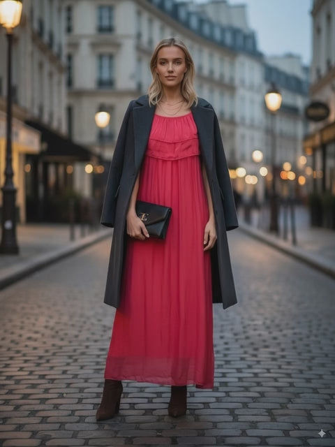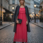Volanele din zona umerilor adaugă volum și structură, conturând un look spectaculos și feminin. Nuanța vibrantă de ciclam conferă energie și eleganță, iar croiala lejeră transformă această rochie într-o alegere stilată și confortabilă.
