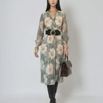 Rochie lungă cu print floral, mânecă lungă, elastic talie, decolteu în V kaki