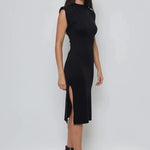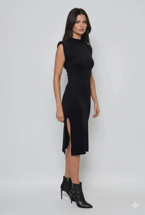 Rochie midi din tricot cu slituri laterale negru, o alegere ideală pentru femeile care preferă eleganța simplă. Textura moale din tricot și umerii ascunși oferă o siluetă rafinată, iar sliturile laterale aduc dinamism și un plus de feminitate.