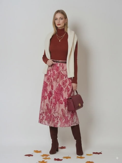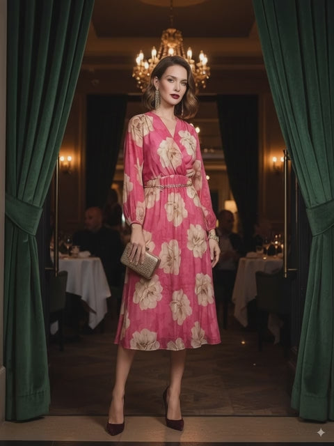 Rochie vascoza cu maneca larga si print floral-Ciclam