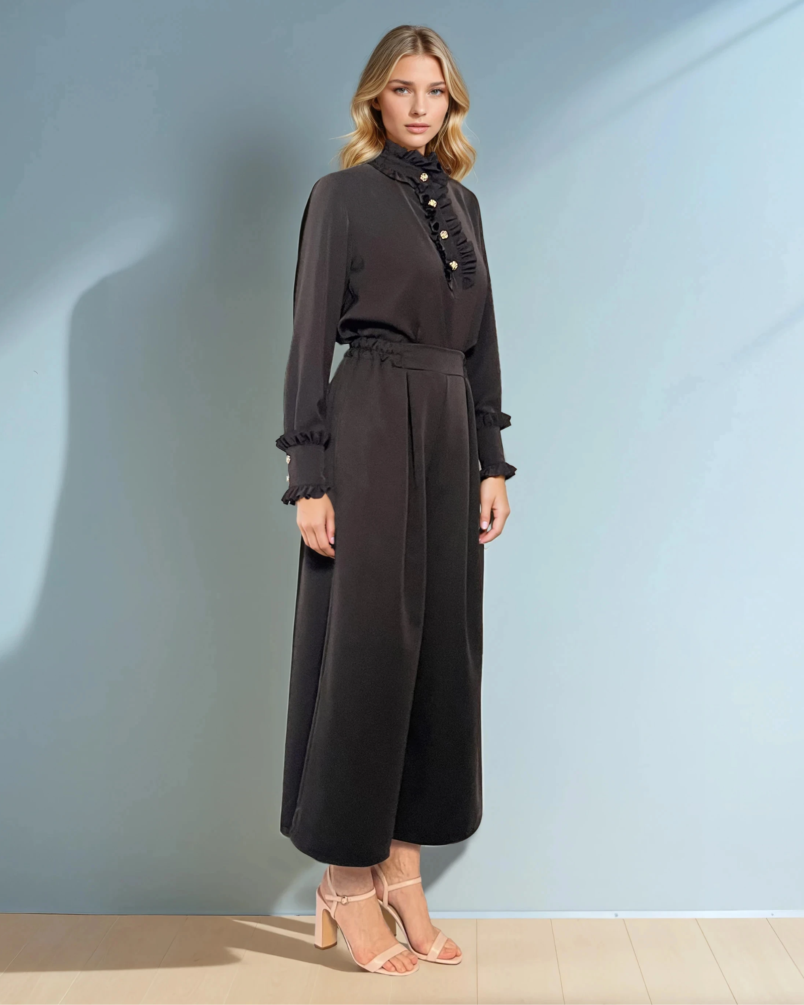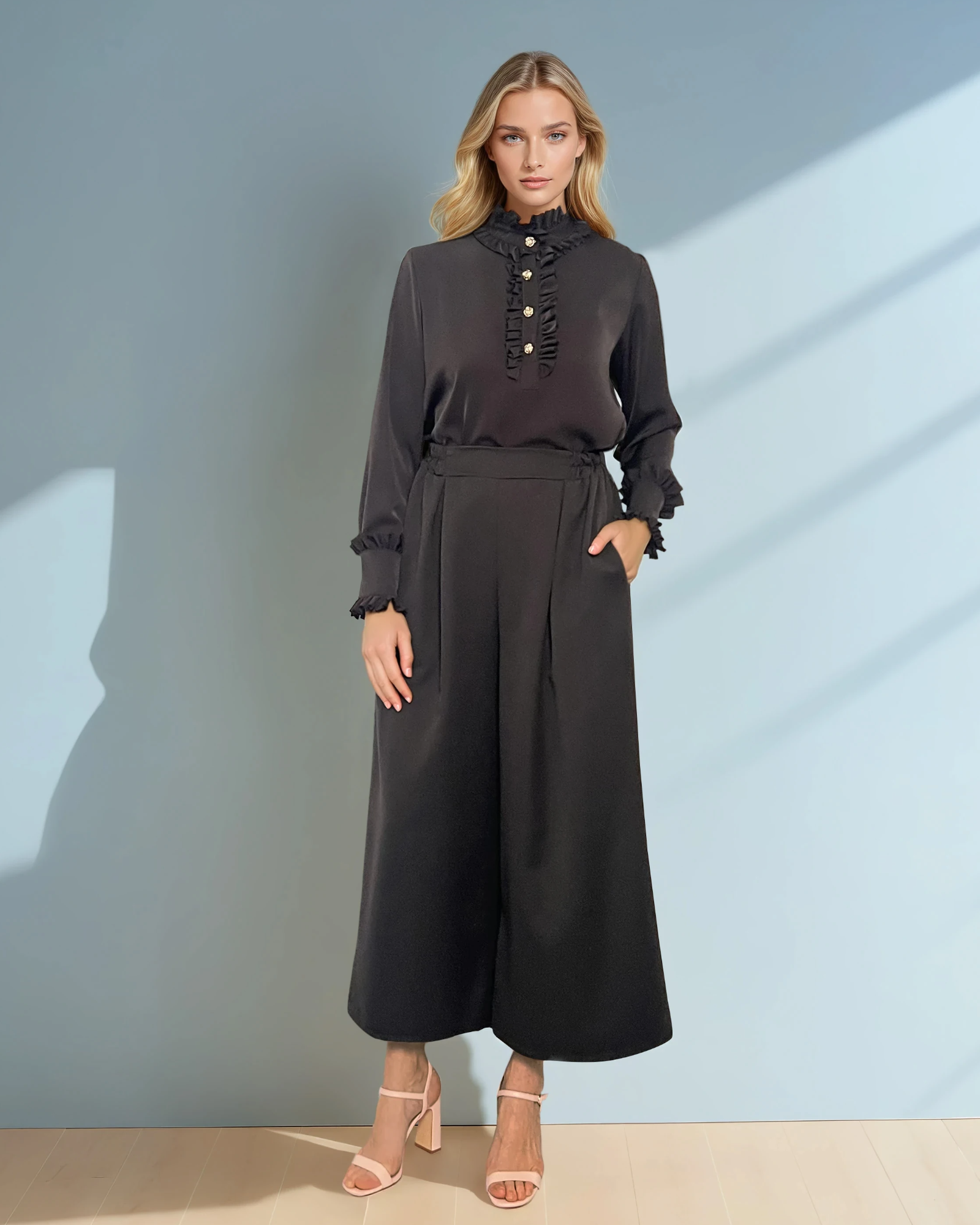 Bluză din voal cu volane la guler și mâneci negru impresionează prin eleganța clasică și detaliile atent lucrate. Voalul fin conferă fluiditate și rafinament, iar volanele adaugă un plus de stil și dinamism ținutei.