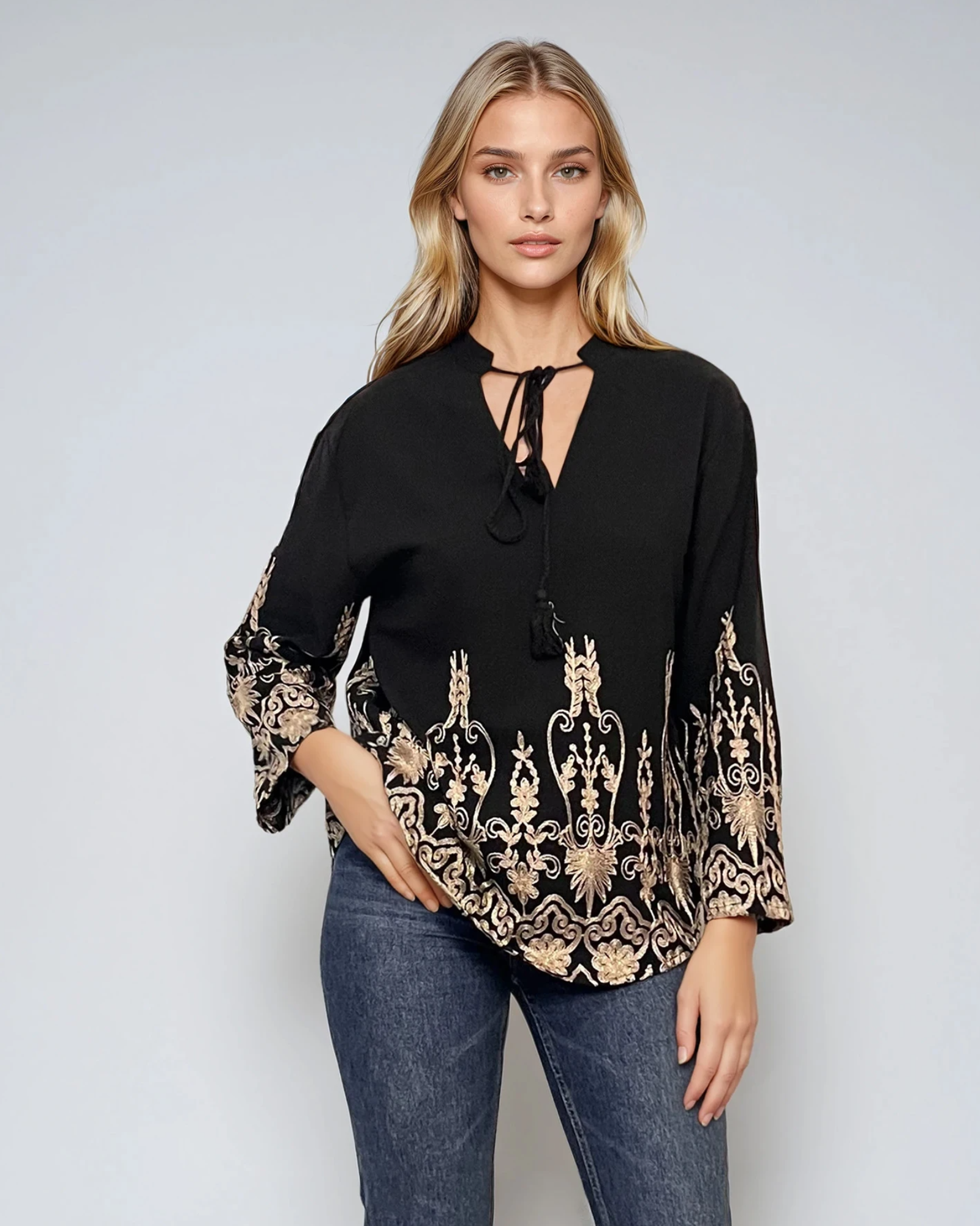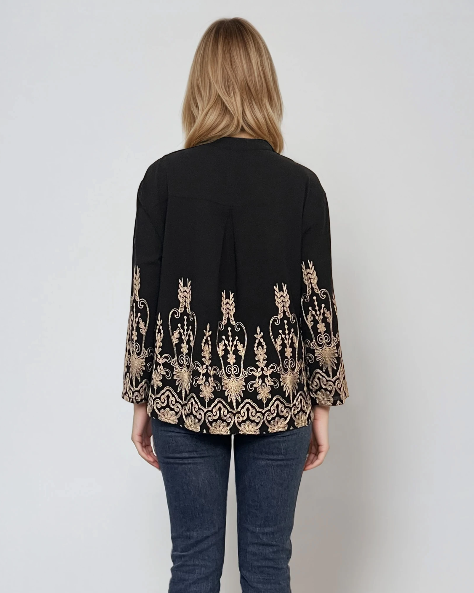 Bluză tip ie din bumbac cu broderie aurie și mânecă lungă negru