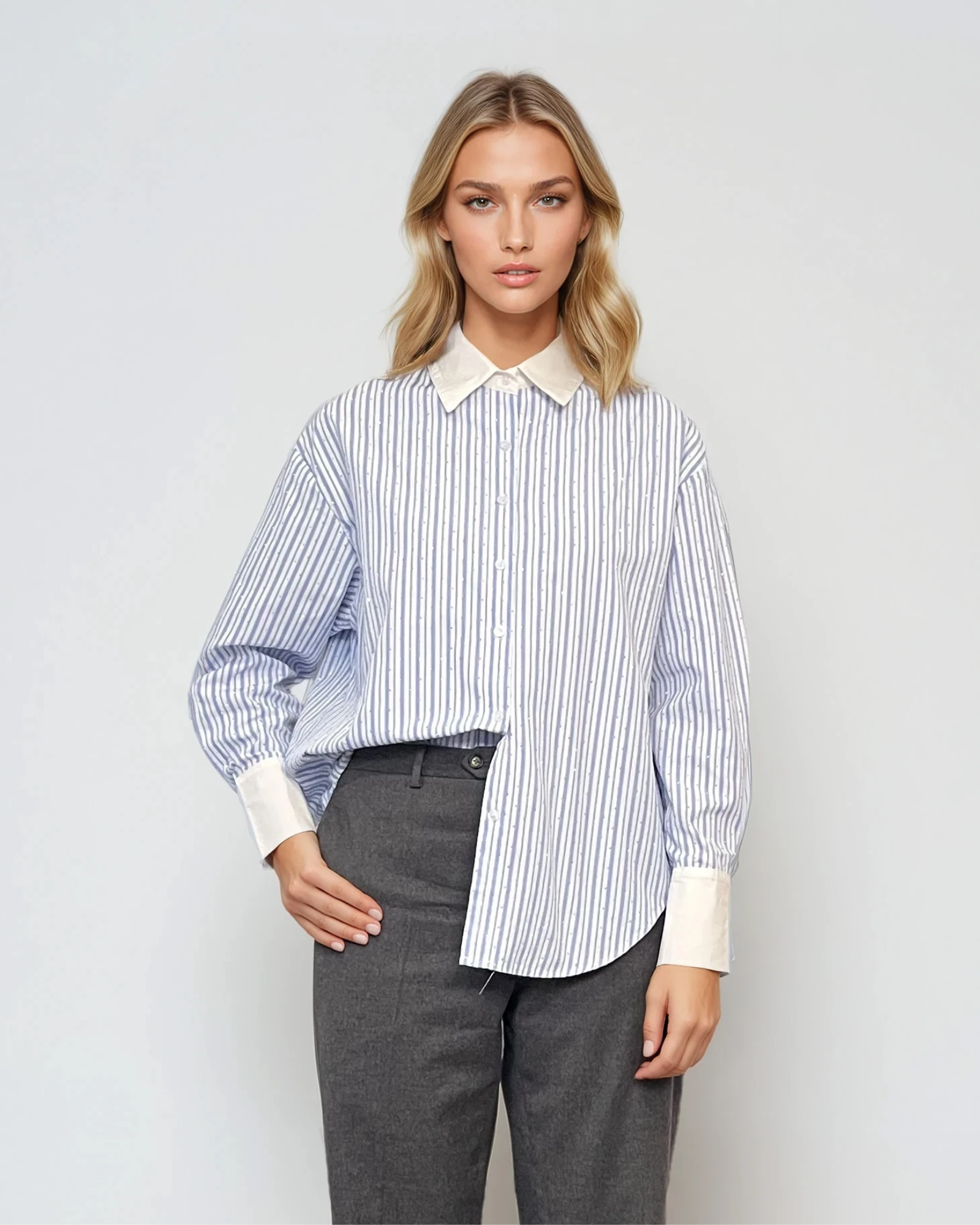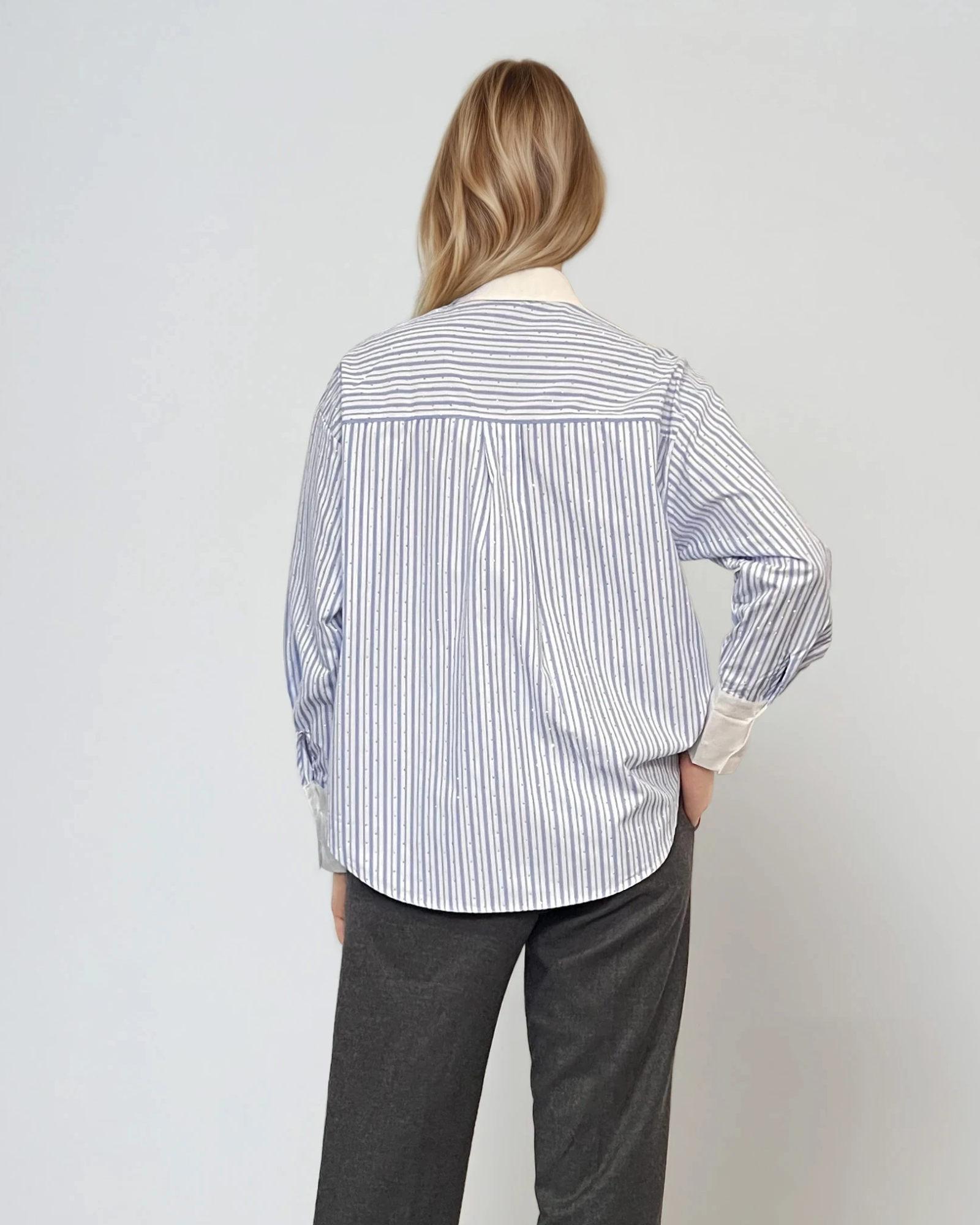 Cămașă albă cu dungi albastre și strasuri fine pentru birou albastru