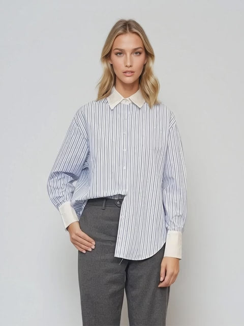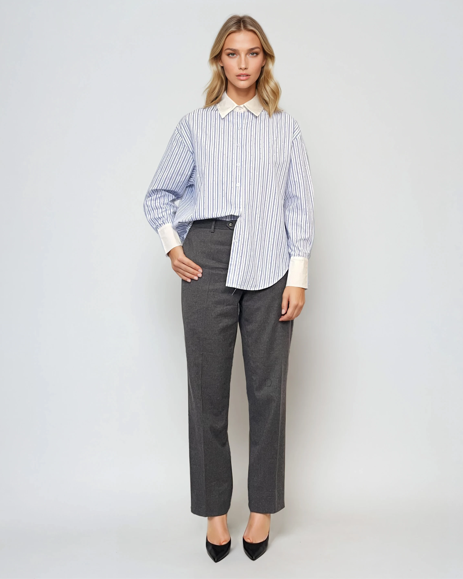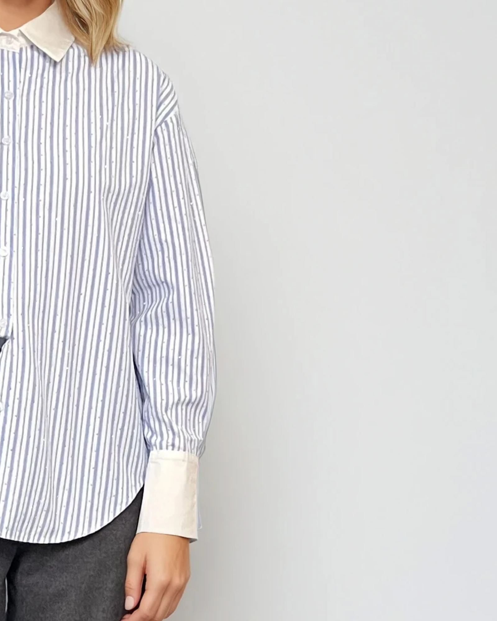 Cămașă albă cu dungi albastre și strasuri fine pentru birou albastru aduce un plus de personalitate ținutelor office, păstrând un aer elegant și actual. Detaliile discrete și materialul ușor de călcat o fac ideală și pentru combinații casual cu stil.