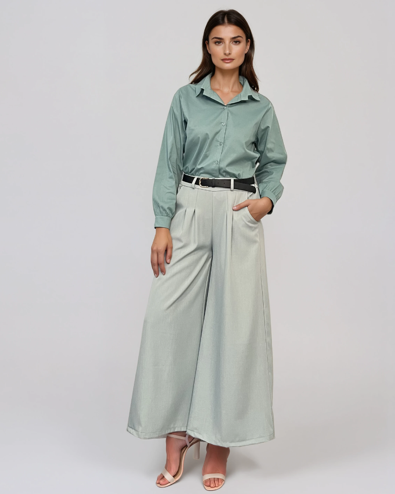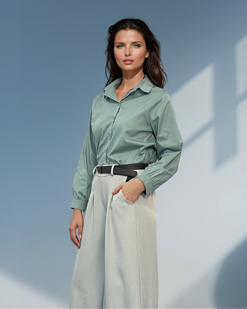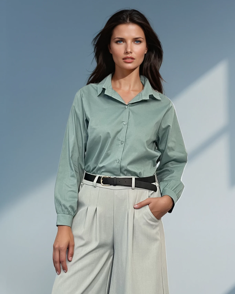 Cămașă din bumbac poplin cu mânecă lungă aqua aduce un plus de prospețime și stil garderobei tale. Poplinul oferă structură și eleganță discretă, iar croiala lejeră asigură confort zilnic. Ideală pentru birou sau ținute casual chic.