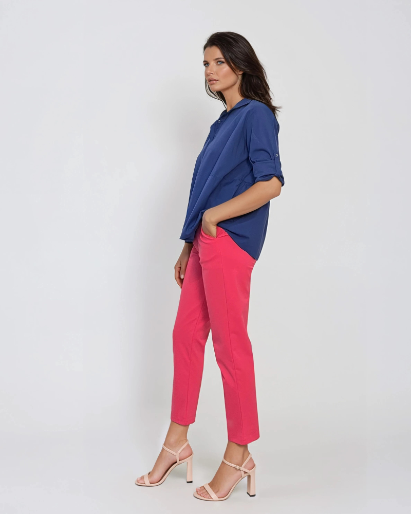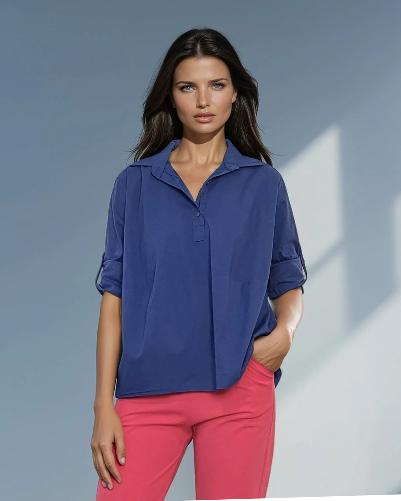 Cămașă din bumbac uni albastru completează perfect o ținută casual sau smart casual. Croiala largă și mâneca 3/4 oferă confort și libertate de mișcare.