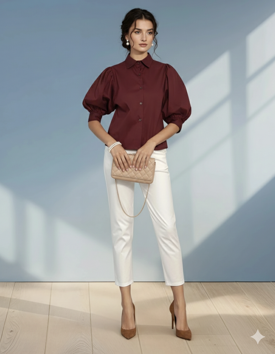 Cămașă poplin cu mâneci 3/4 bufante grena oferă un stil elegant și feminin, potrivit pentru garderoba office modernă sau pentru ținute de zi rafinate. Poplinul de calitate asigură păstrarea formei și un aspect îngrijit.