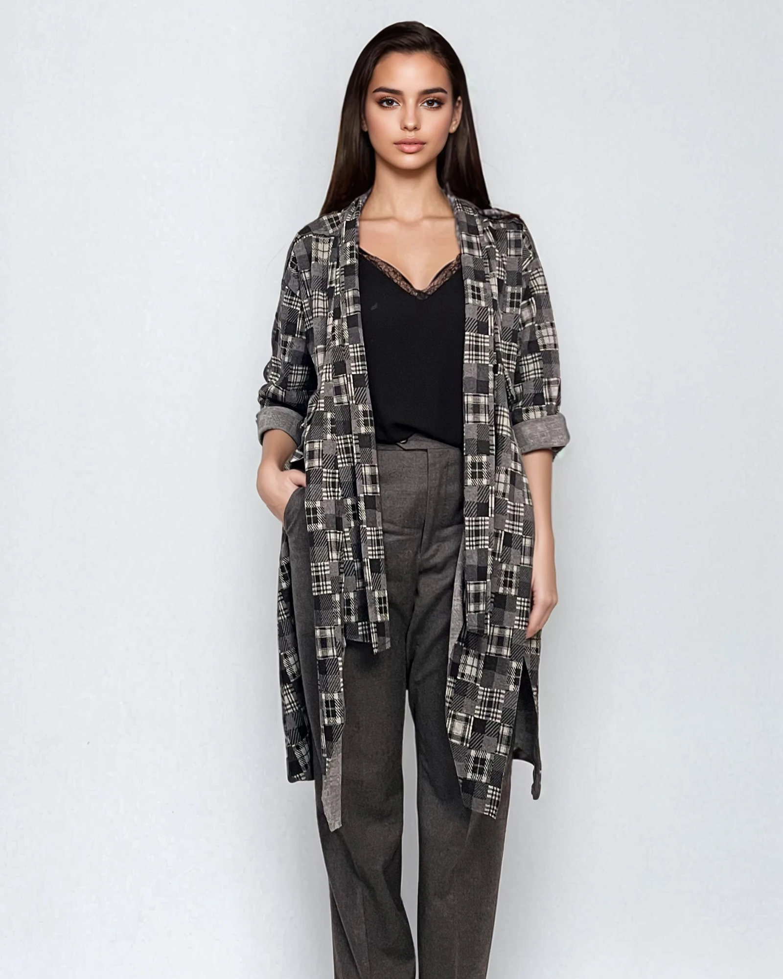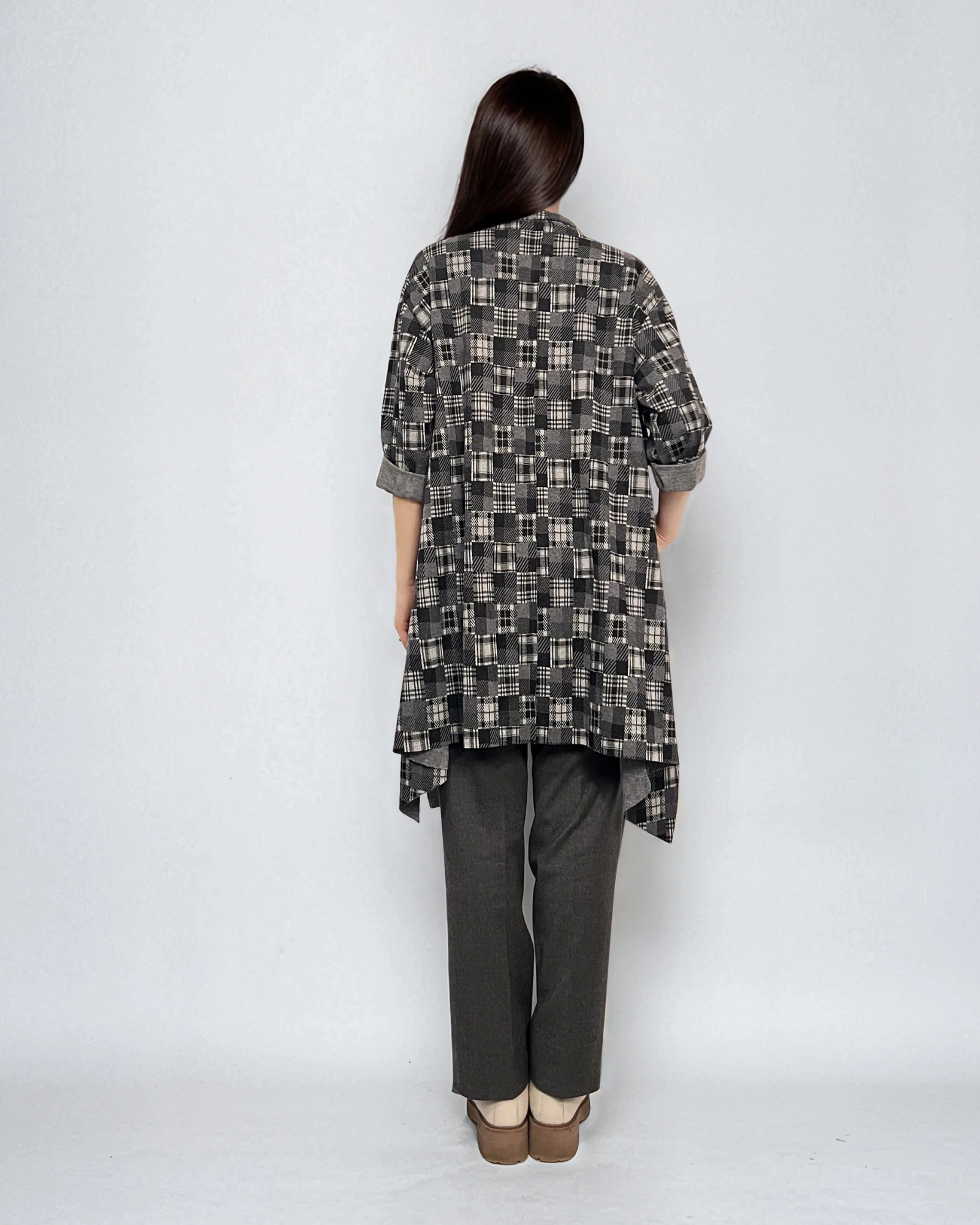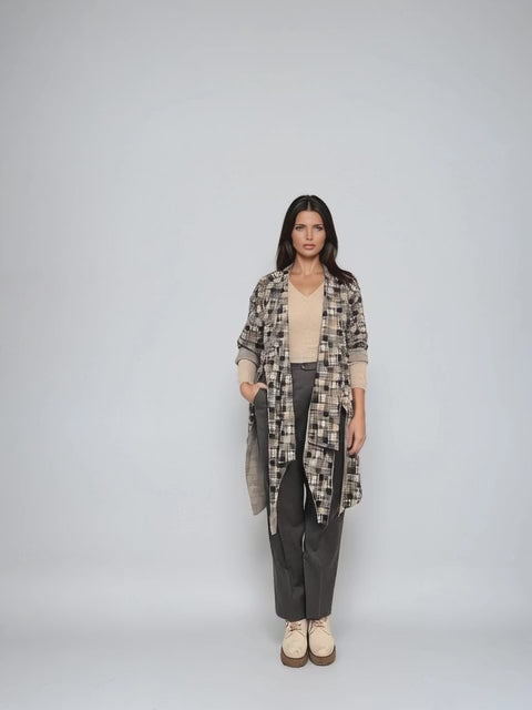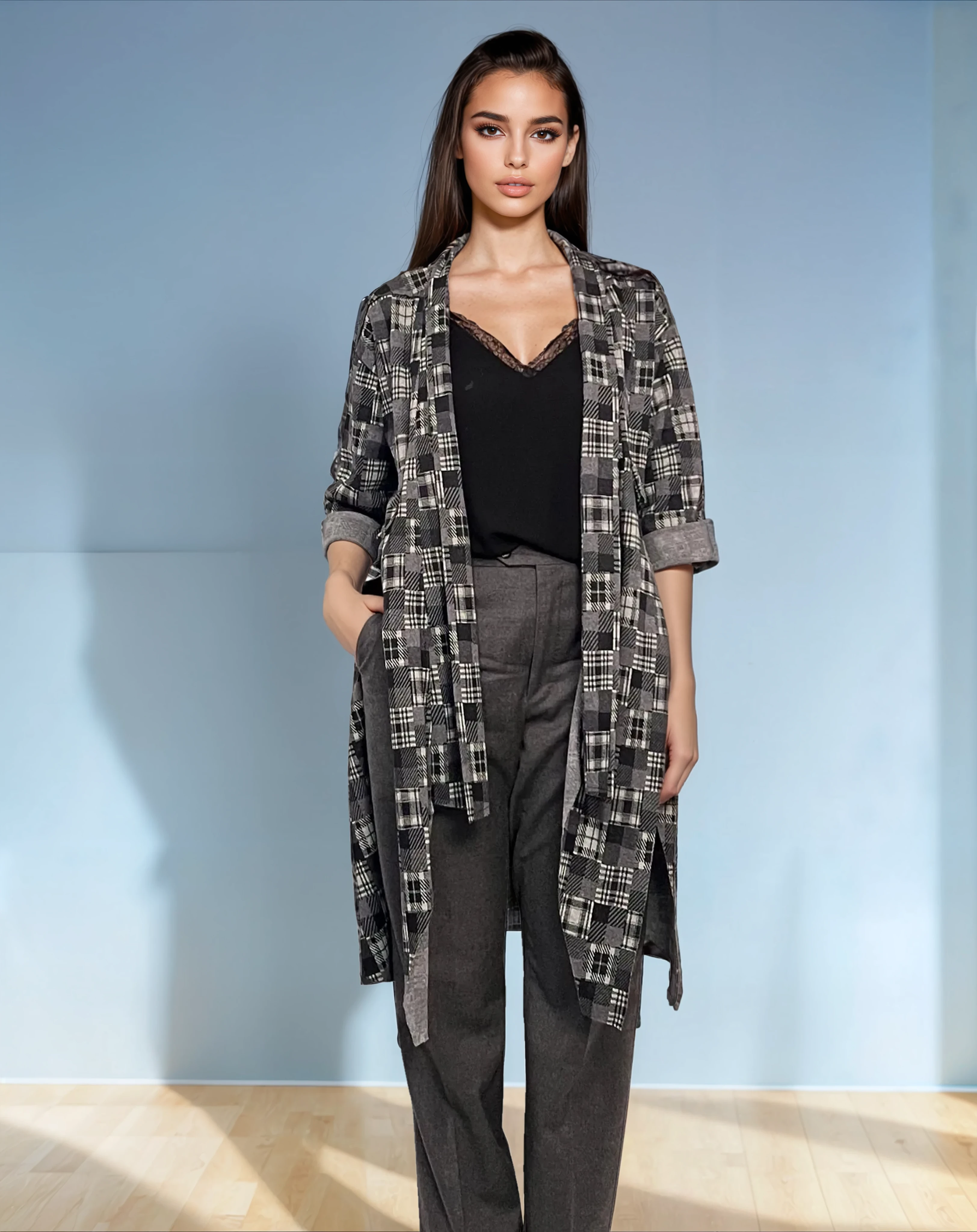 Cardigan lung cu șlițuri laterale și imprimeu geometric discret gri completează armonios ținutele stratificate din sezonul rece. Designul fluid și croiala relaxată permit purtarea confortabilă peste piese casual sau elegante, de la S la L.