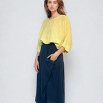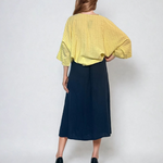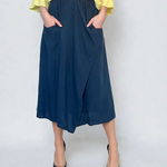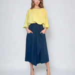 Fustă midi cu buzunare și nasture bleumarin este alegerea ideală pentru un look rafinat și confortabil. Cu o croială clasică și detalii simple, această fustă este ușor de integrat în garderoba de zi cu zi.