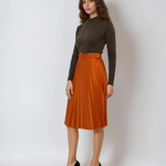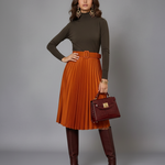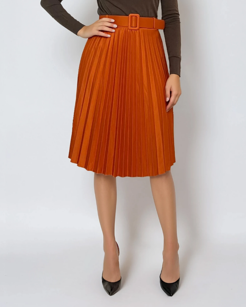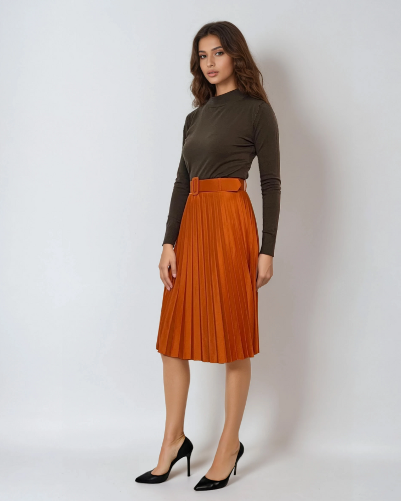 Fustă plisată cu curea cărămiziu este o piesă caldă și stilată, ideală pentru sezonul de toamnă sau pentru ținute cu personalitate. Croiala vaporoasă se potrivește excelent cu pulovere sau bluze lejere.