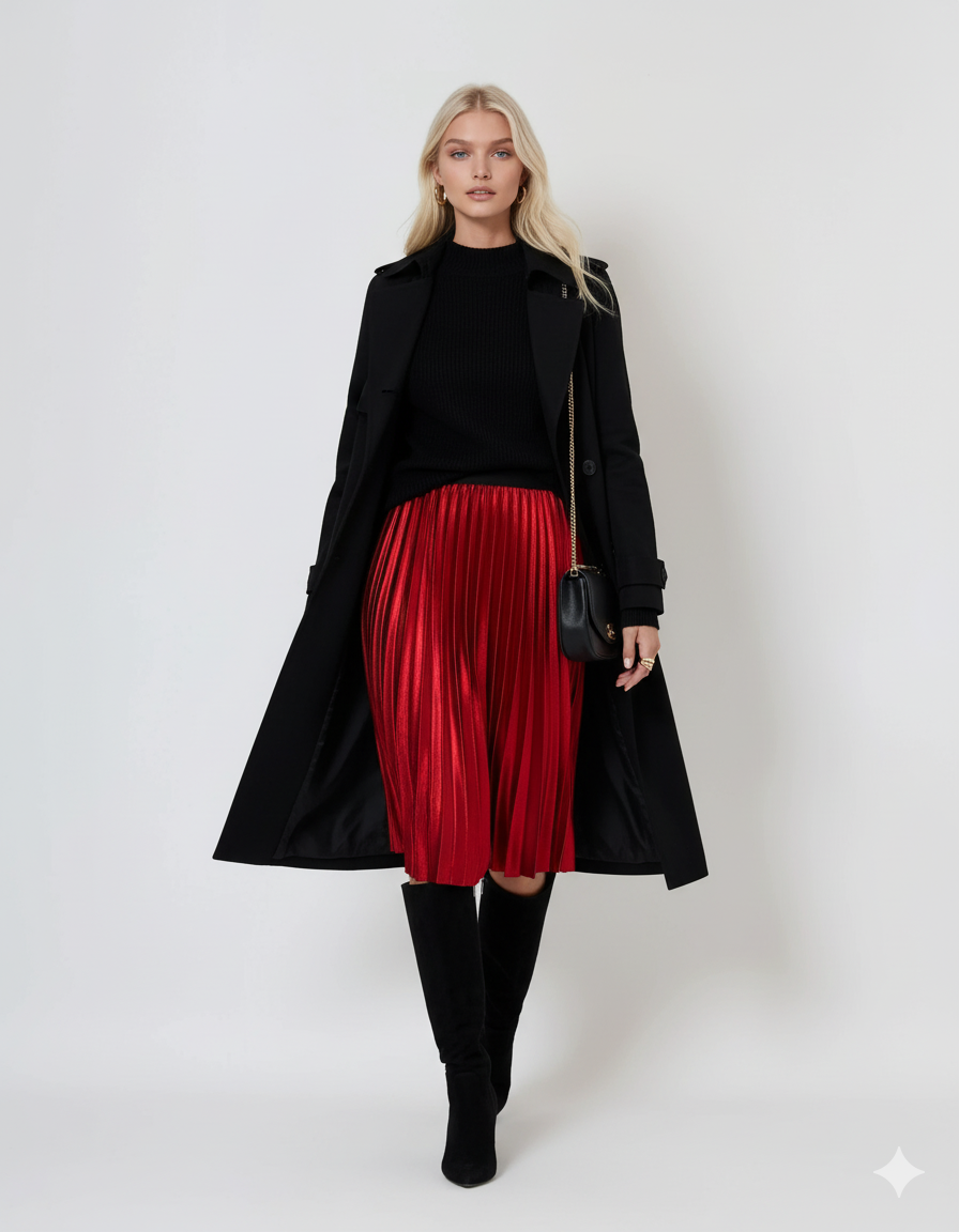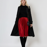 Fustă plisată midi din catifea roșie impresionează prin textura sa elegantă și aspectul rafinat. Croiala lejeră, completată de talia elastică, face ca această piesă să se potrivească perfect pentru mărimile S-L, oferind confort și stil în același timp.