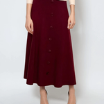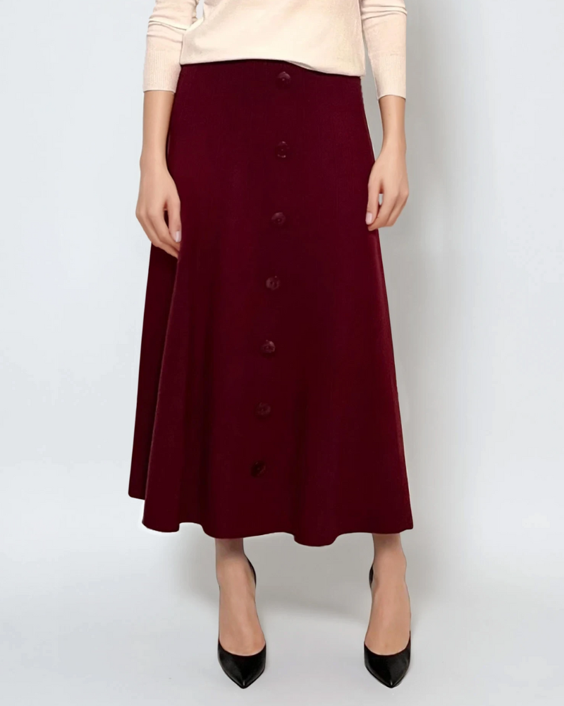 Fustă tricotată cloș cu nasturi grena adaugă culoare și eleganță garderobei tale de toamnă. Este ideală pentru ținutele de birou, dar și pentru momentele relaxate în oraș.