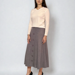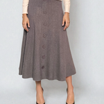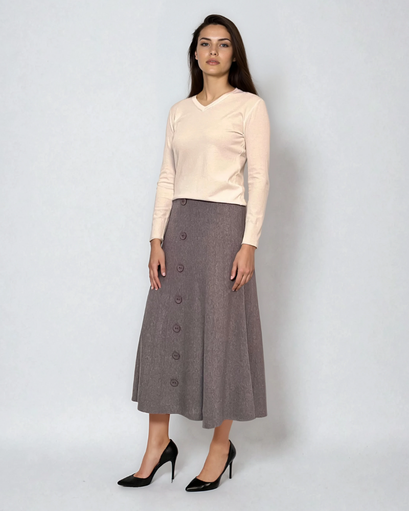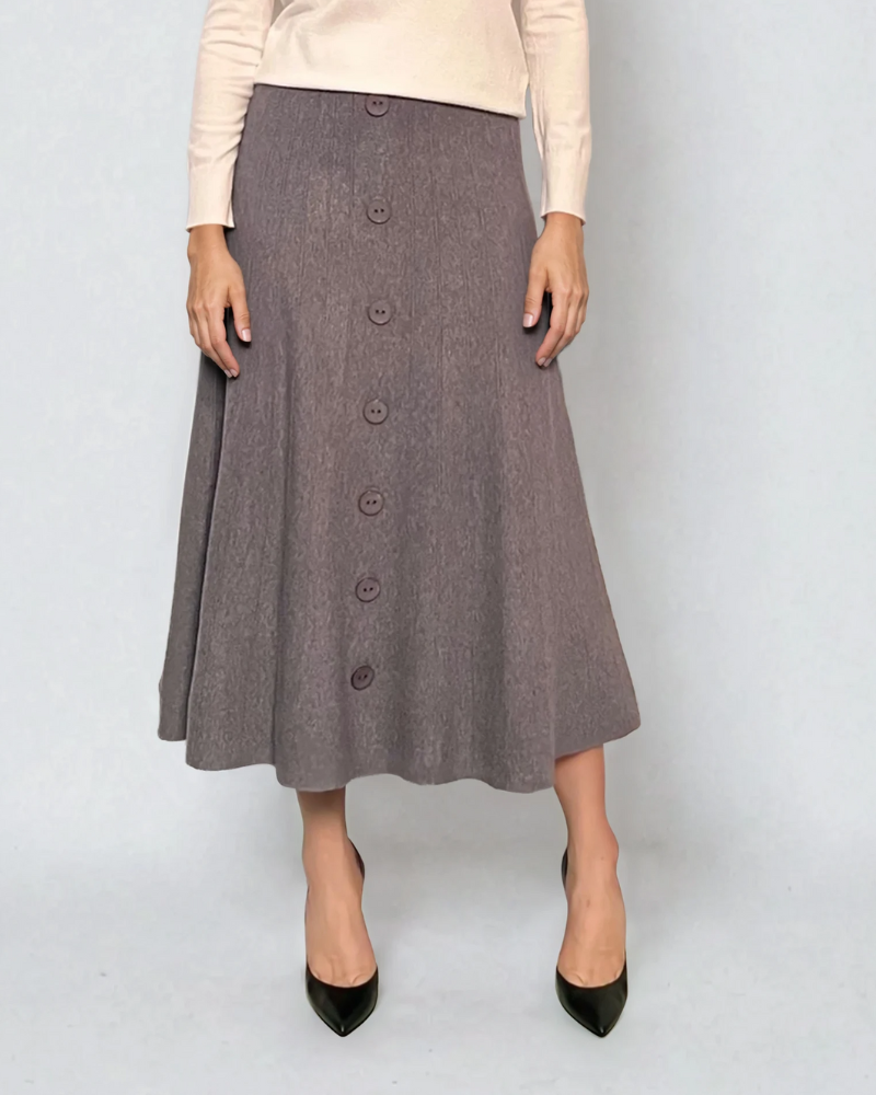 Fustă tricotată cloș cu nasturi gri este o piesă esențială pentru un look urban și relaxat. Se asortează cu ușurință la pulovere sau cămăși, fiind potrivită pentru birou sau ieșiri de weekend.