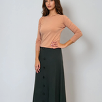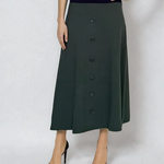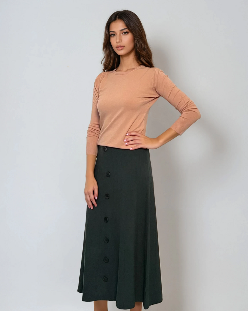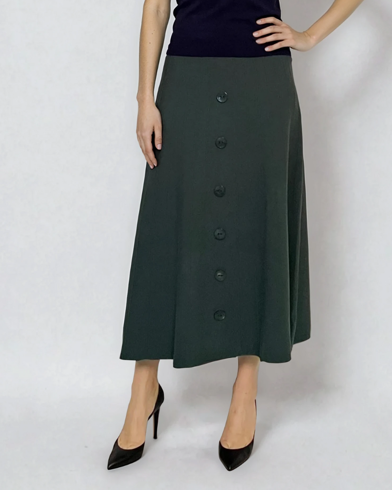 Fustă tricotată cloș cu nasturi verde închis este o alegere inspirată pentru ținutele de toamnă. Materialul moale și croiala amplă asigură confort, în timp ce nasturii decorativi adaugă un accent stilat și feminin.