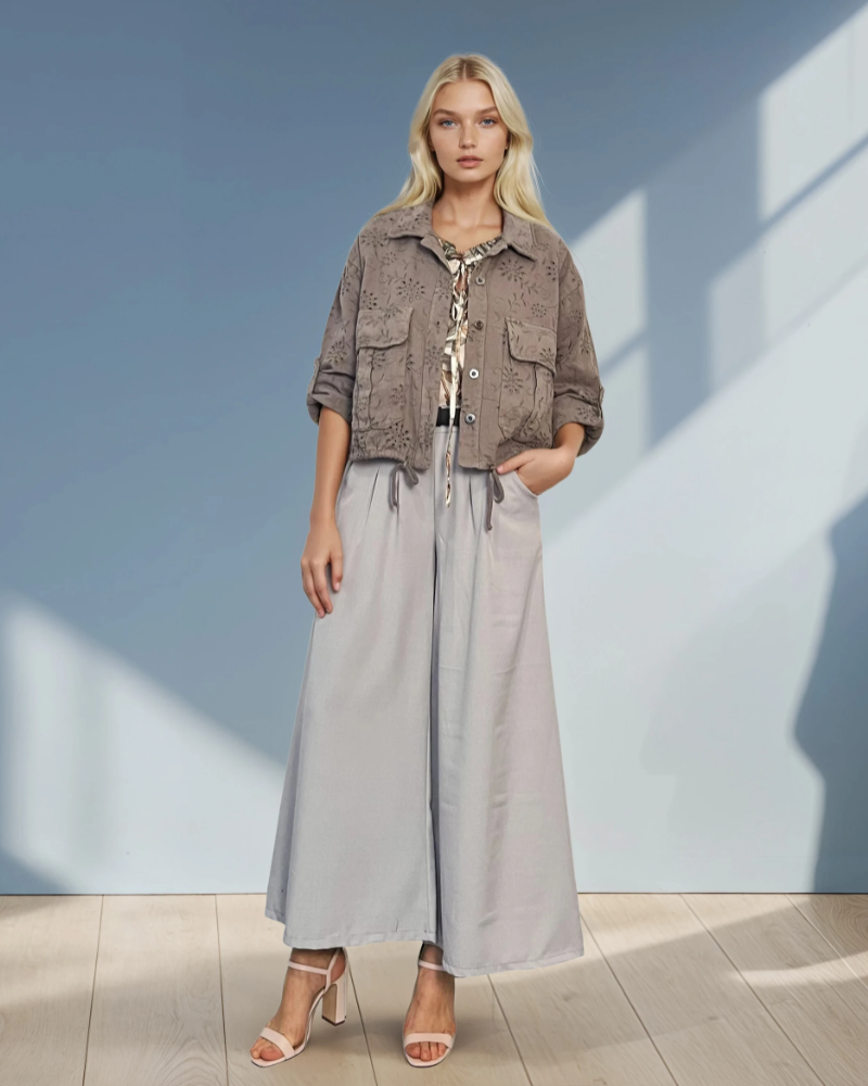 Jachetă scurtă din bumbac cu broderie spartă grej este o piesă versatilă și feminină. Croiala lejeră asigură confort, iar șnurul din talie permite ajustarea siluetei.