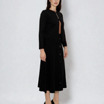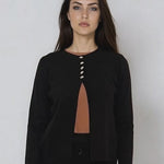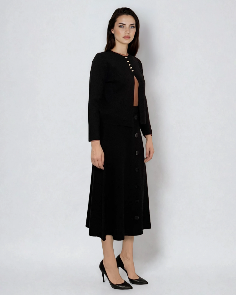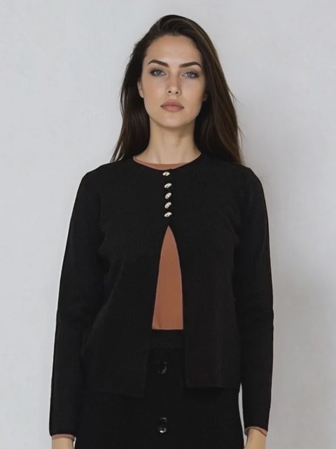 Jachetă tricotată cu nasturi aurii neagru este o alegere clasică și elegantă pentru orice garderobă. Nuanța neutră o face ușor de asortat, iar nasturii aurii adaugă o notă de lux discret.