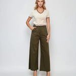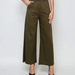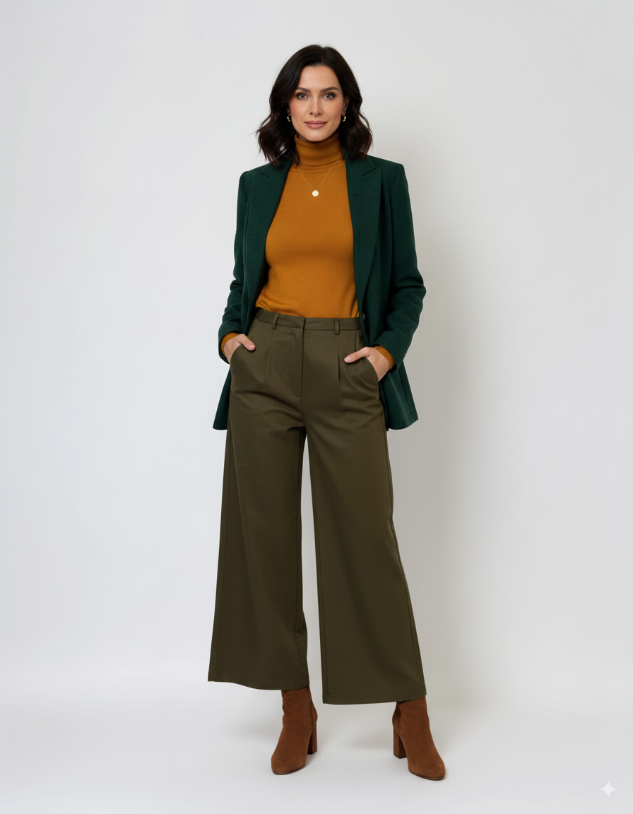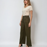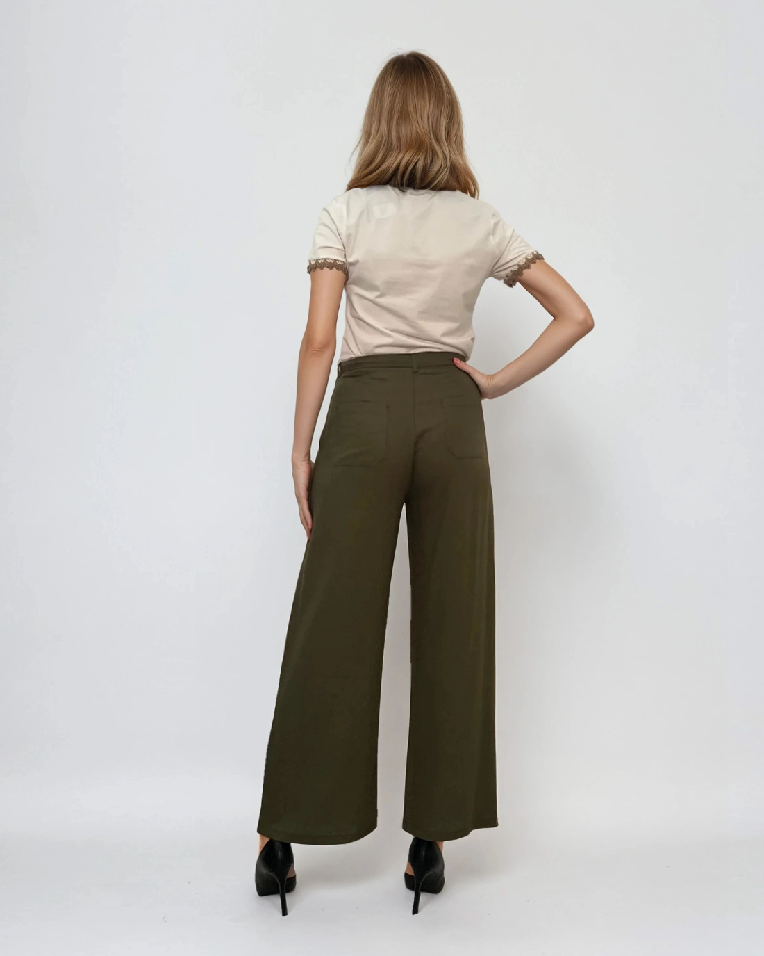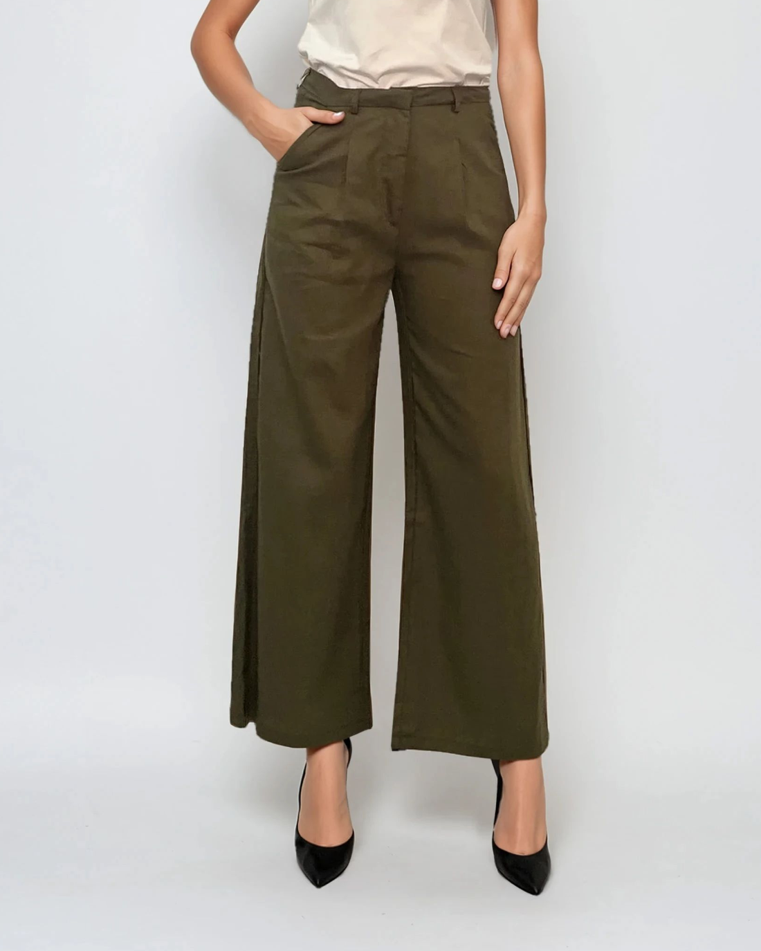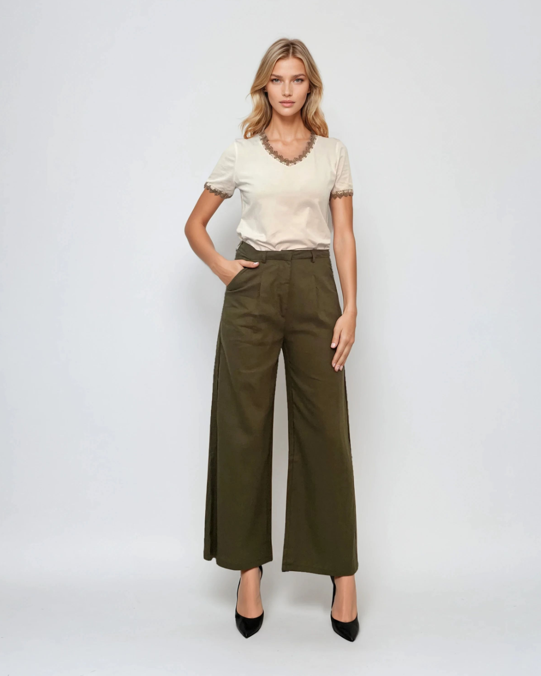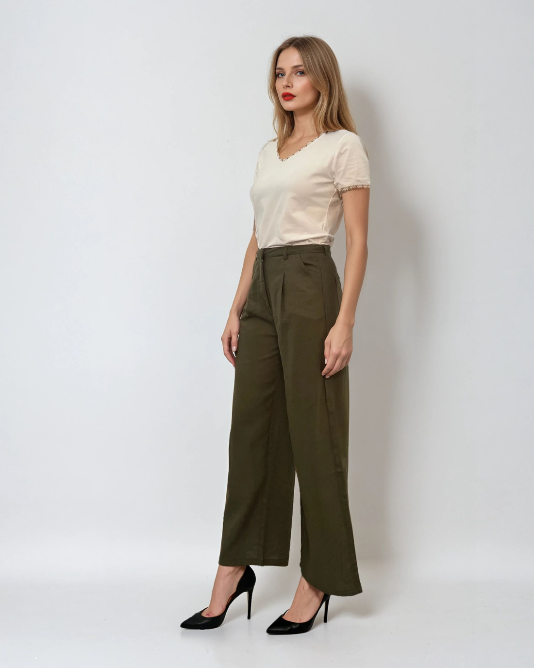 Pantaloni evazați cu fermoar și buzunare kaki sunt perfecți pentru un look casual, dar cu un aer sofisticat. Materialul din bumbac și in asigură confort și o senzație naturală la purtare.