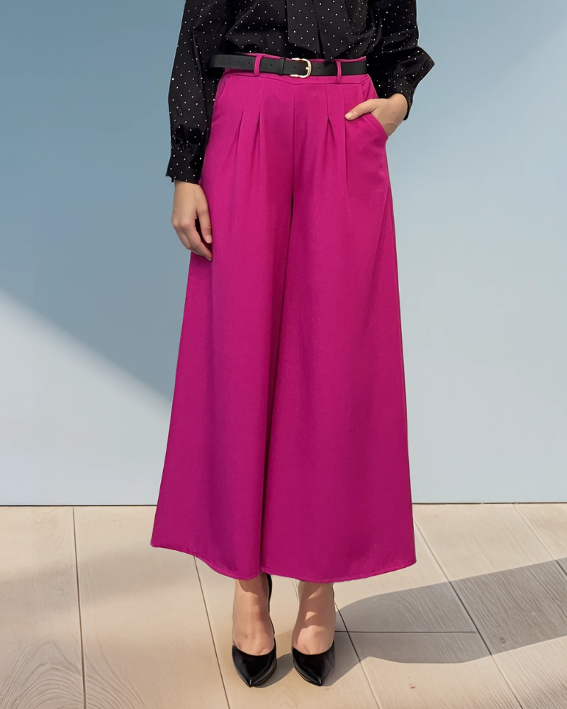 Pantaloni largi din vâscoză cu pense și curea inclusă fucsia aduc energie și stil ținutelor tale. Croiala amplă și talia marcată evidențiază silueta. Mărime unică S-L, potriviți pentru M și L sau un S foarte larg, ca în imagini. Modelul are 1.78 m, astfel lungimea poate părea mai scurtă.