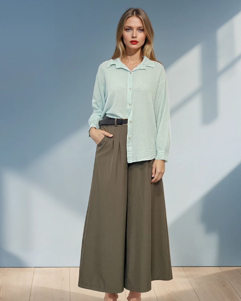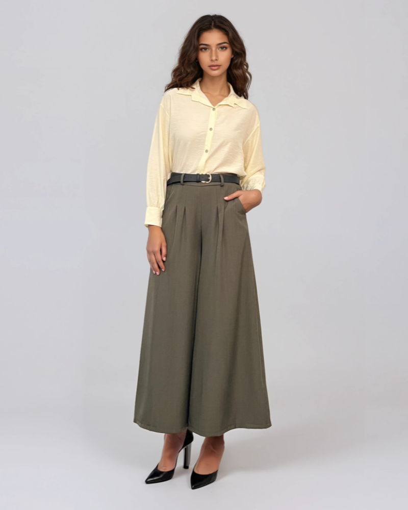 Pantaloni largi din vâscoză cu pense și curea inclusă kaki completează perfect ținutele moderne. Designul fluid și buzunarele laterale asigură confort și stil. Mărime unică S-L, potriviți pentru M și L sau un S purtat lejer, ca în imagini. Modelul are 1.78 m, astfel pot părea mai scurți.