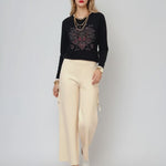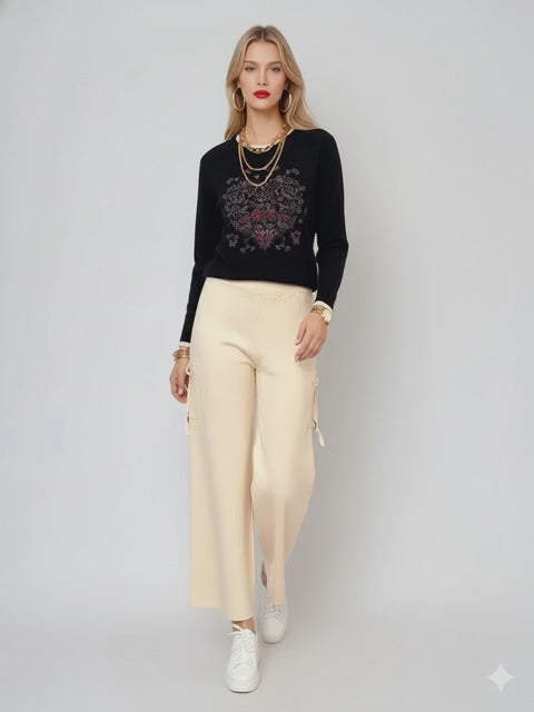 Pulover cu inimă brodată negru cu alb este o piesă vestimentară cu un design jucăuș și contrast vizual plăcut. Broderia delicată în formă de inimă iese în evidență pe fundalul închis, adăugând o notă romantică și personalitate ținutei.