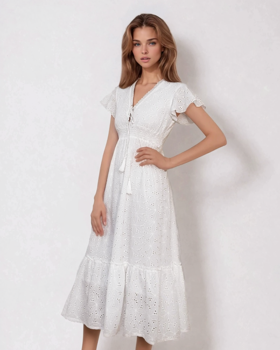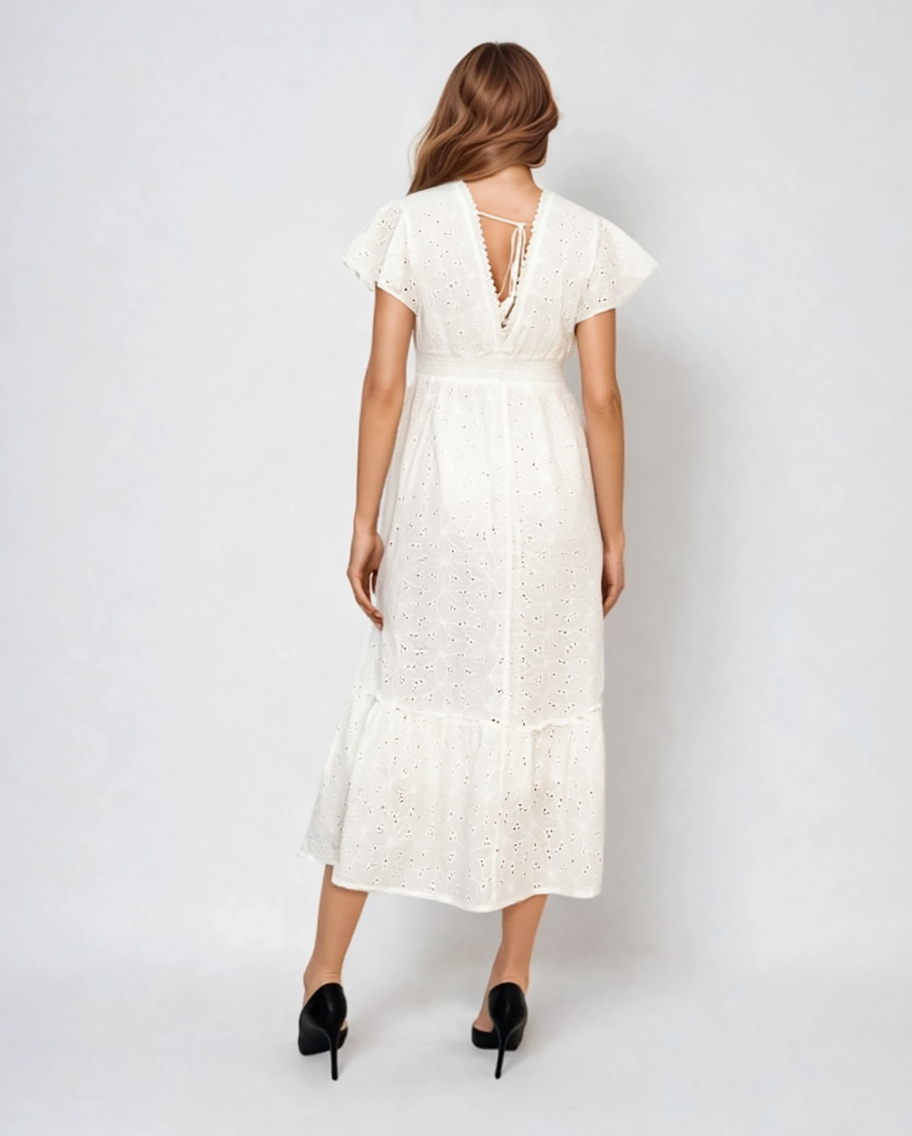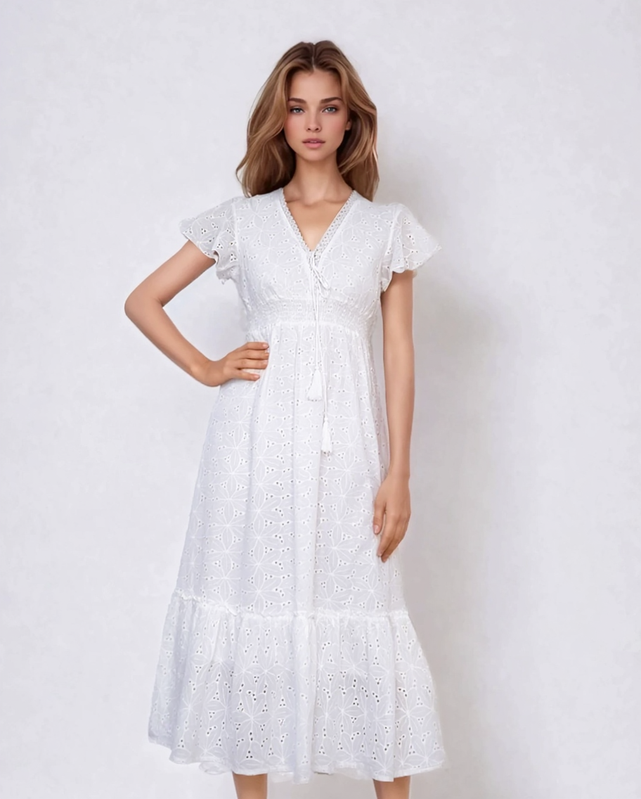 Rochie lungă cu broderie spartă, decolteu în V cu șnur și elastic în talie alb