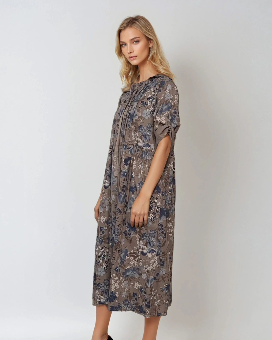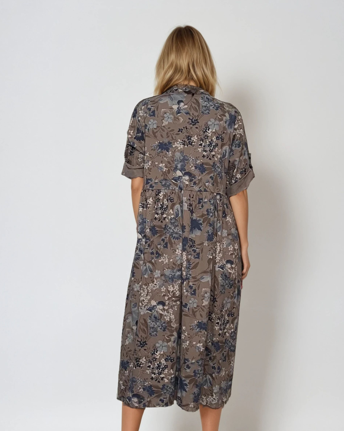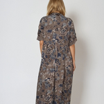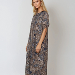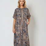 Rochie lungă din bumbac cu print floral și mânecă 3/4 grej este piesa ideală pentru un look sofisticat dar relaxat. Buzunarele mari, nasturii decorativi și printul floral stilizat se îmbină armonios cu nuanța neutră grej, făcând această rochie potrivită pentru mai multe stiluri și ocazii.