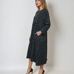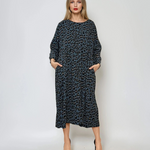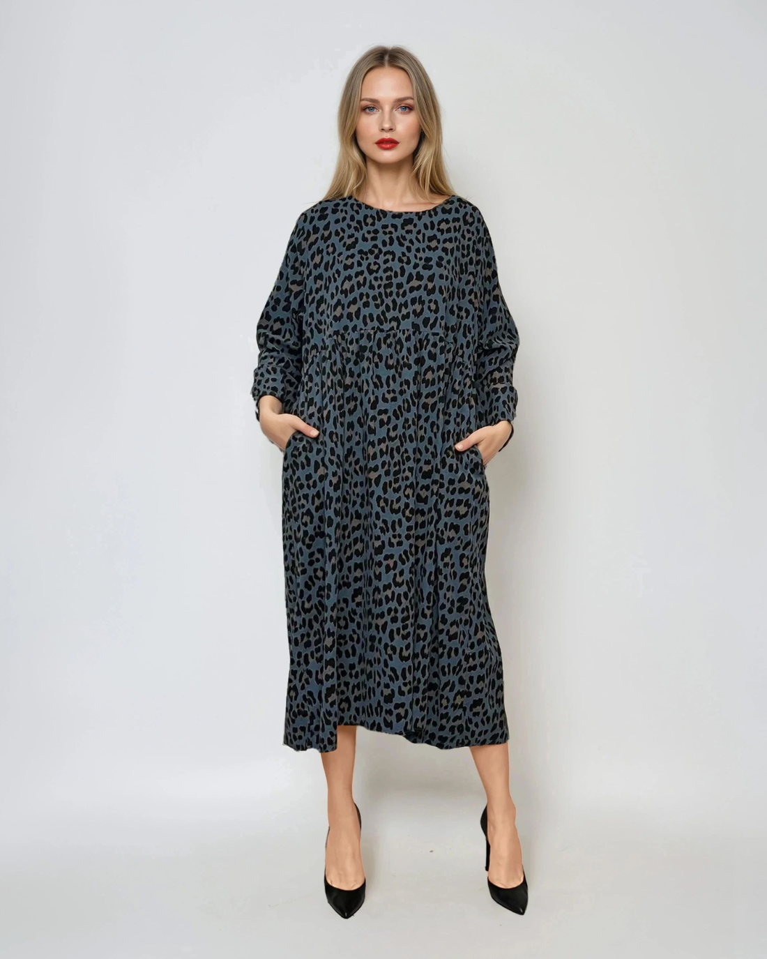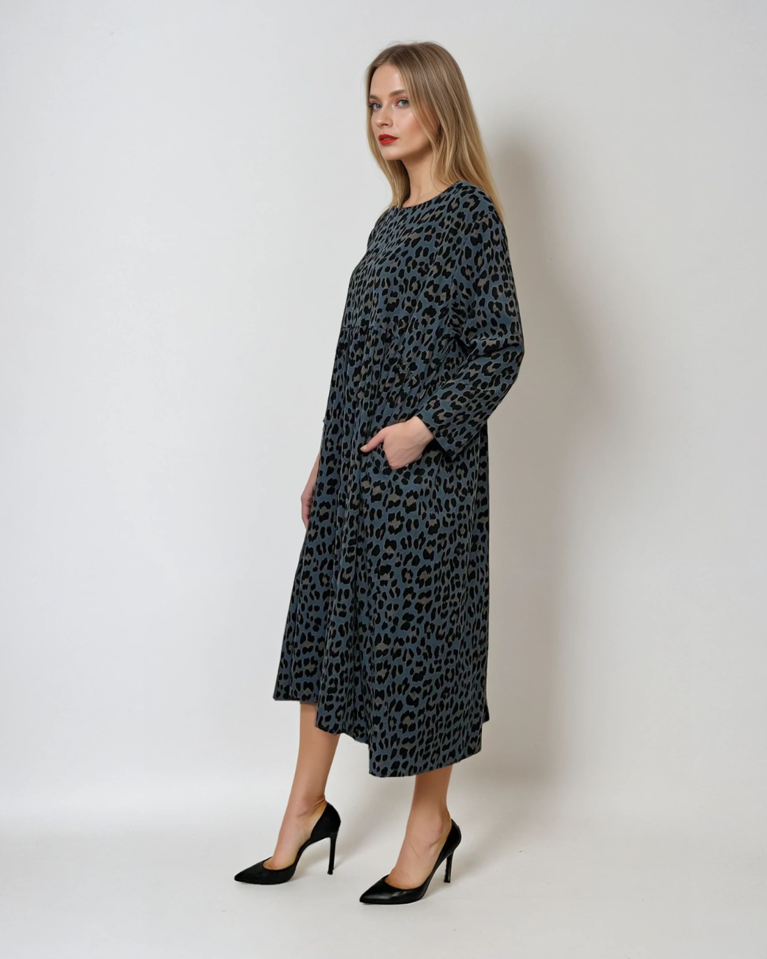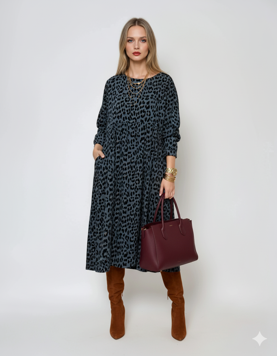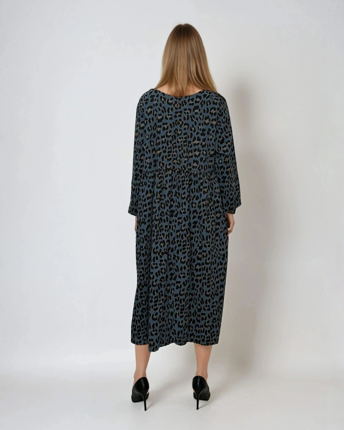 Rochie lungă din raiat cu animal print albastru este alegerea perfectă pentru un look sofisticat și plin de personalitate. Materialul raiat adaugă textură, iar imprimeul animal print în nuanțe de albastru conferă un aer modern și îndrăzneț.