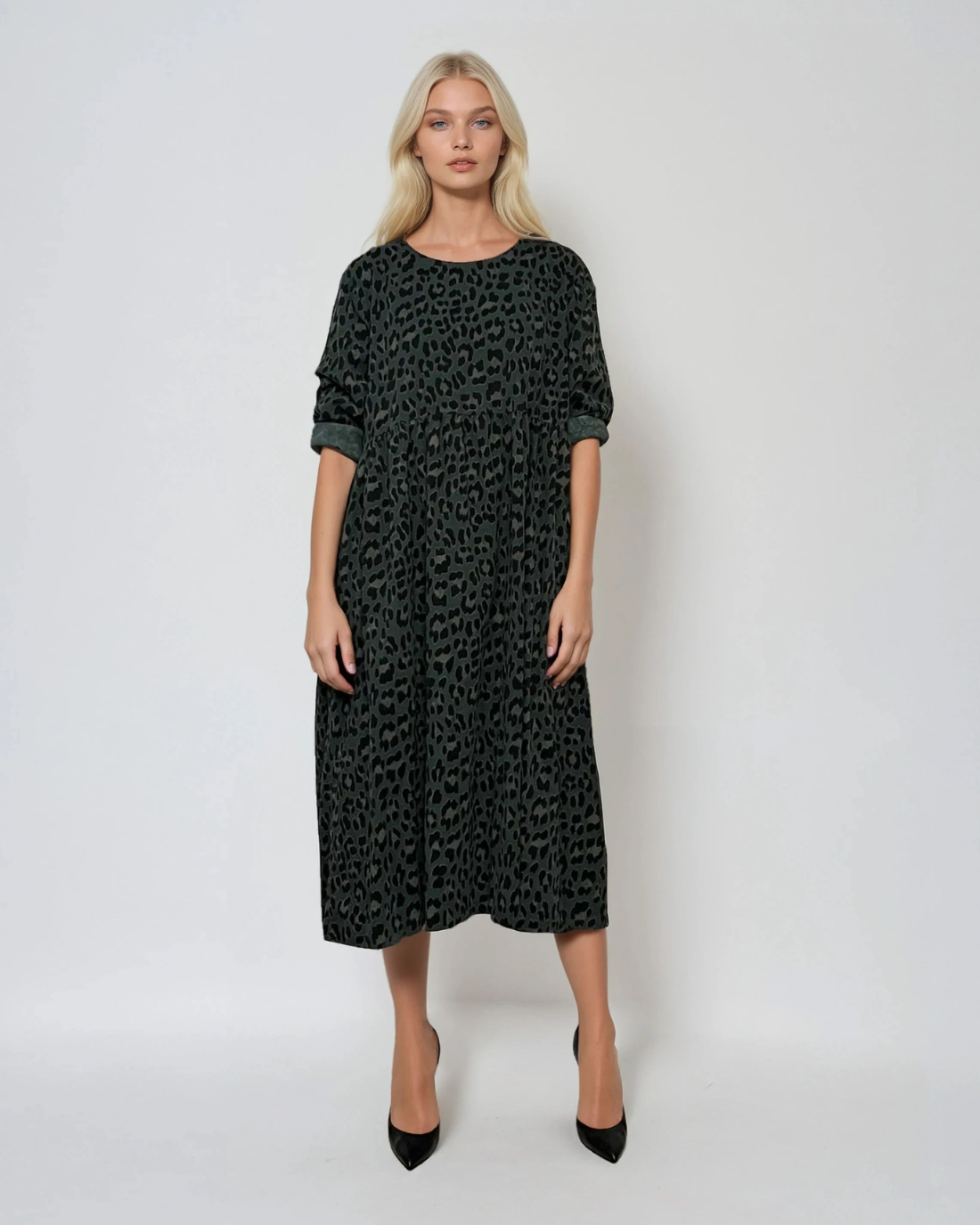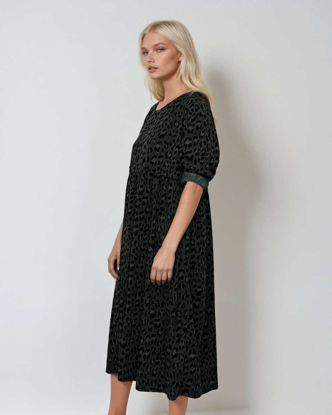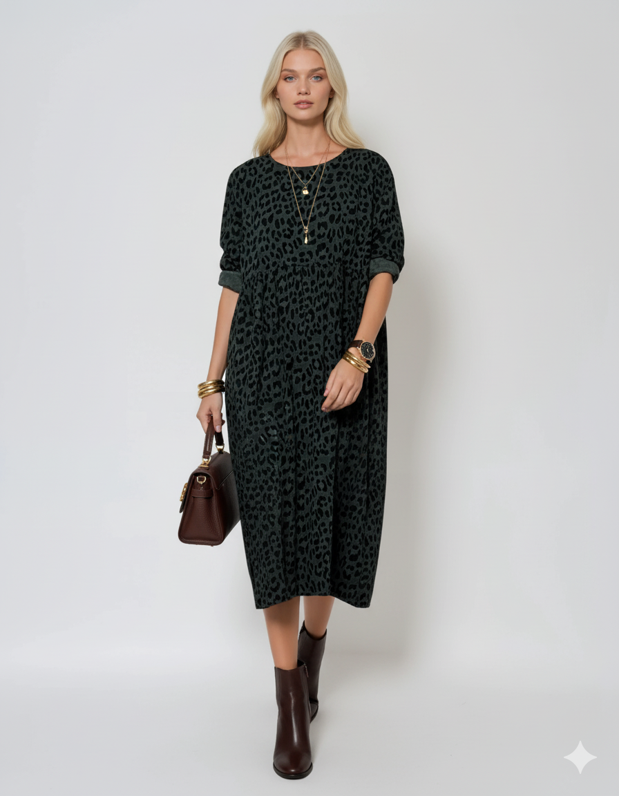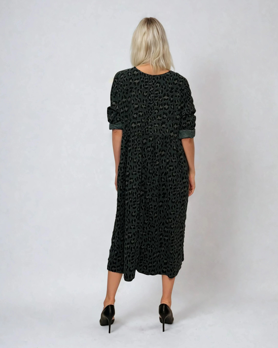 Rochie lungă din raiat cu animal print gri închis aduce un aer sofisticat și versatil garderobei tale. Materialul raiat conferă textură și plăcere la atingere, iar imprimeul animal print în nuanțe de gri închis adaugă un plus de stil și eleganță.