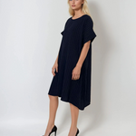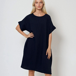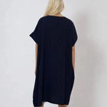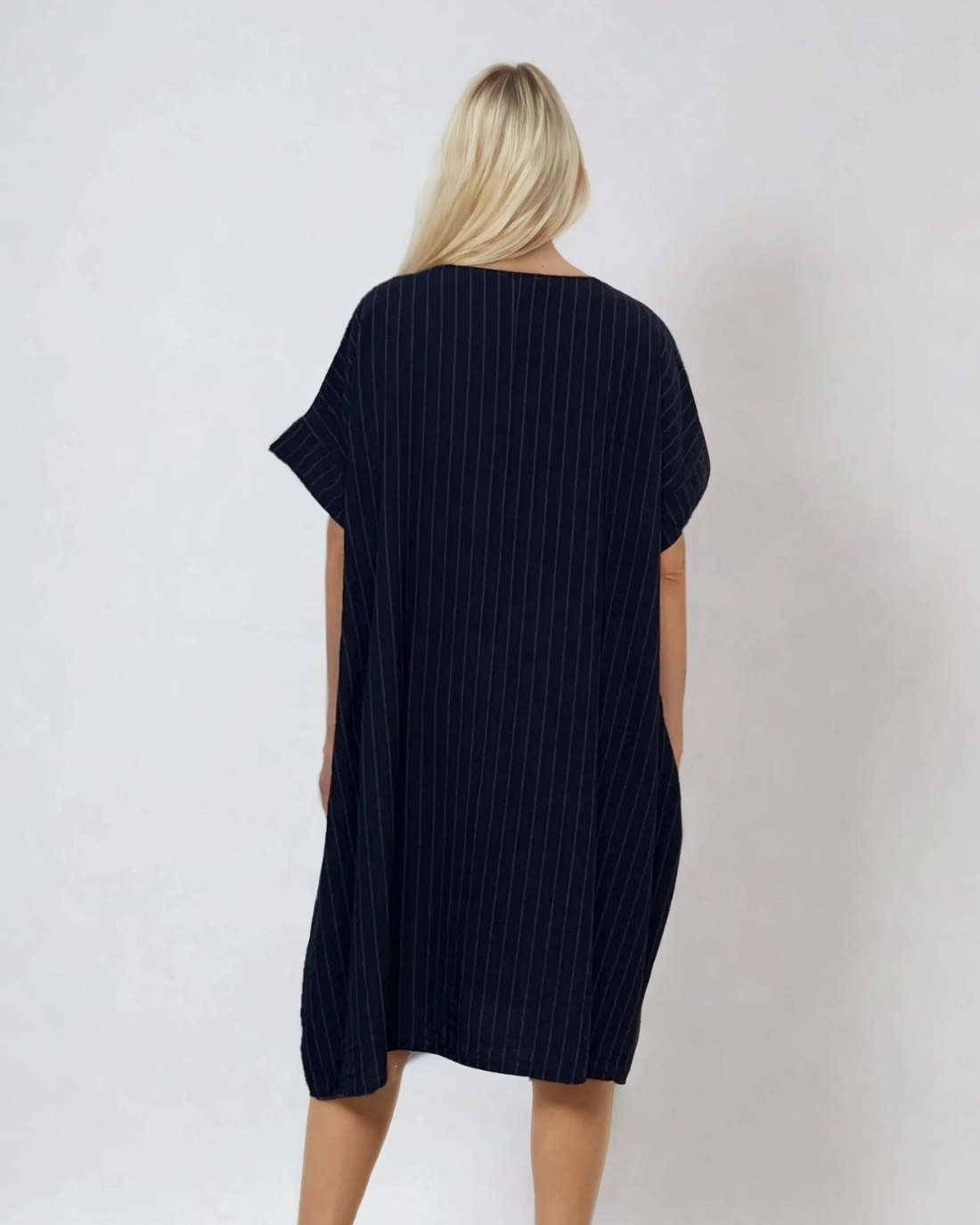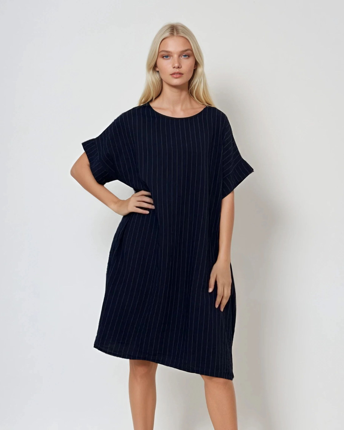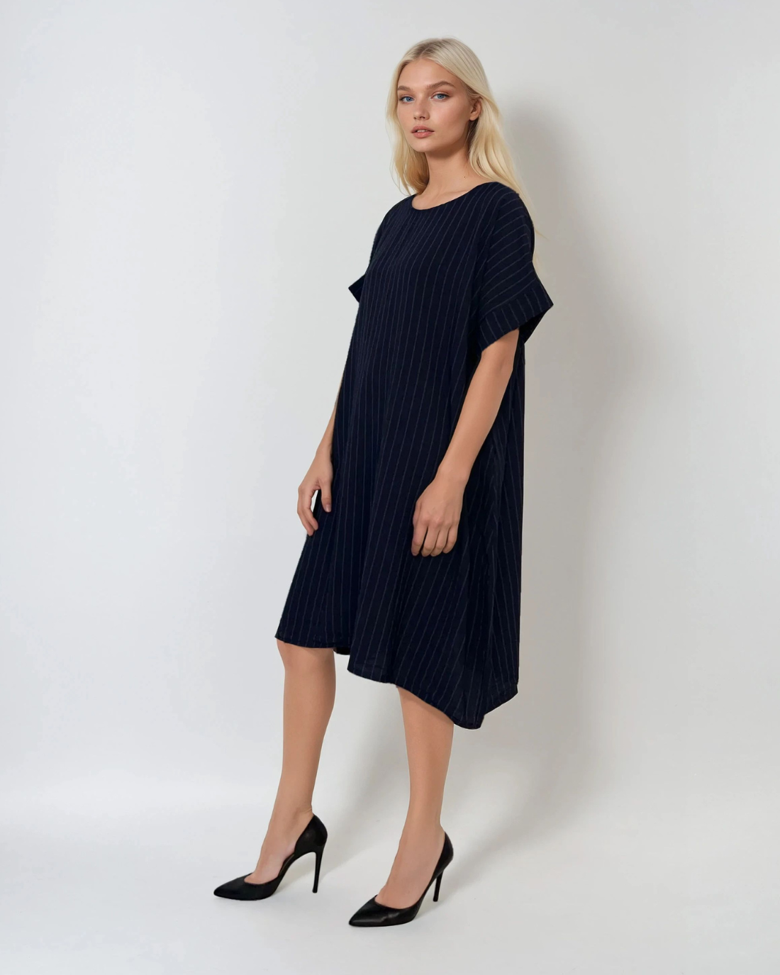 Rochie stil A cu dungi bleumarin aduce un plus de rafinament garderobei tale, inspirată din eleganța marină. Dungile verticale oferă un efect vizual alungit, iar croiala relaxată completează designul aerisit.