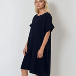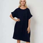 Rochie stil A cu dungi negru oferă un look elegant și relaxat, ideal pentru zilele în care vrei să te simți bine fără să faci compromisuri de stil. Dungile subțiri adaugă un aer modern și rafinat.