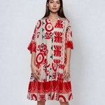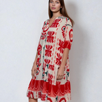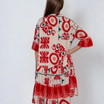 Printul floral în nuanțe intense de roșu adaugă culoare și energie, ideal pentru evenimente în aer liber sau vacanțe.