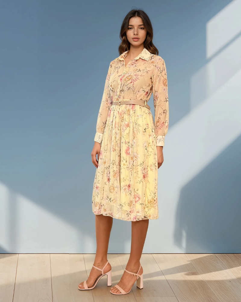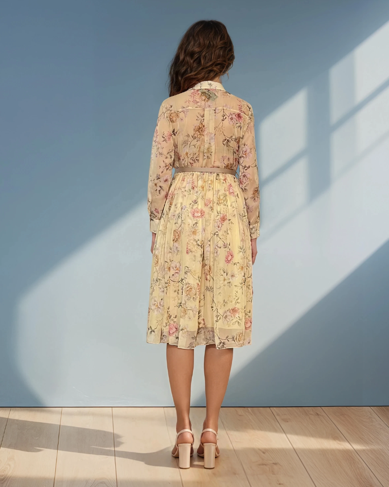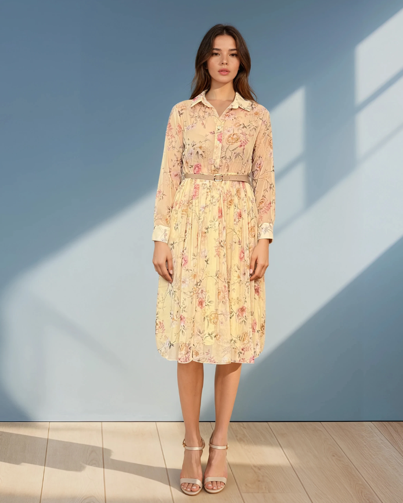 Rochie vaporoasă din voal cu guler tip cămașă și print floral galben