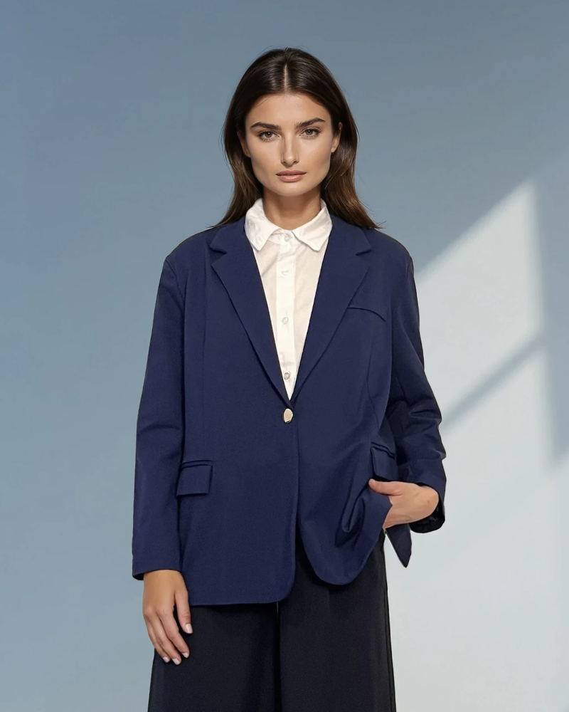 Sacou oversized damă bleumarin este o piesă clasică și versatilă, potrivită pentru garderoba office modernă. Croiala largă permite purtarea confortabilă peste haine stratificate.