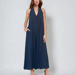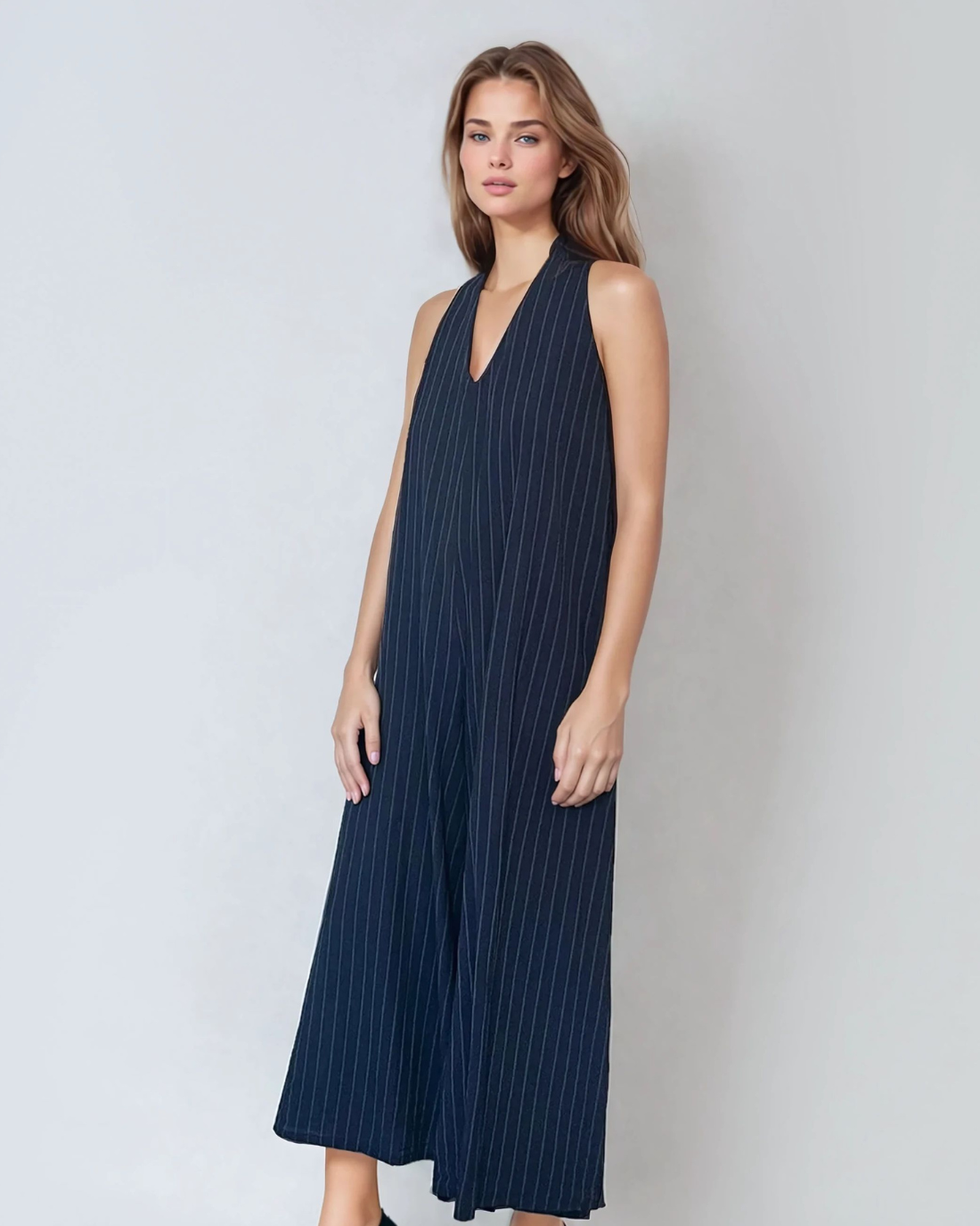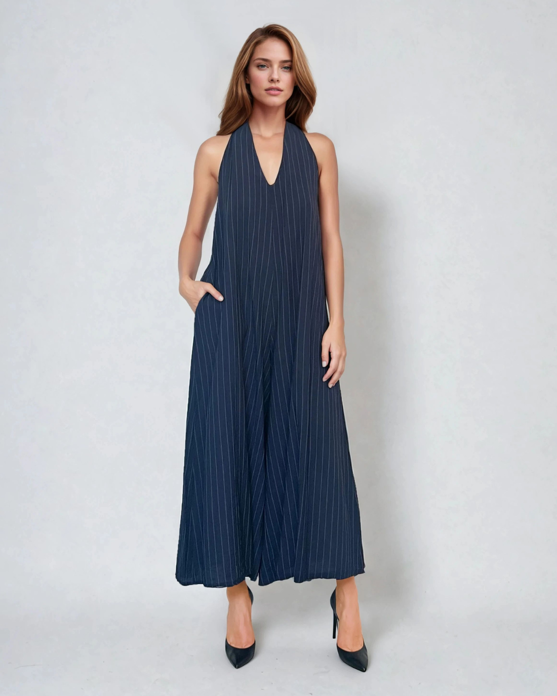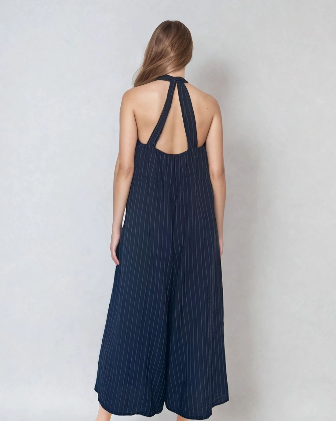 Salopetă în dungi cu spatele gol bleumarin este alegerea ideală pentru zilele în care vrei să combini confortul cu eleganța. Croiala evazată oferă lejeritate în mișcare, iar buzunarele adaugă funcționalitate.