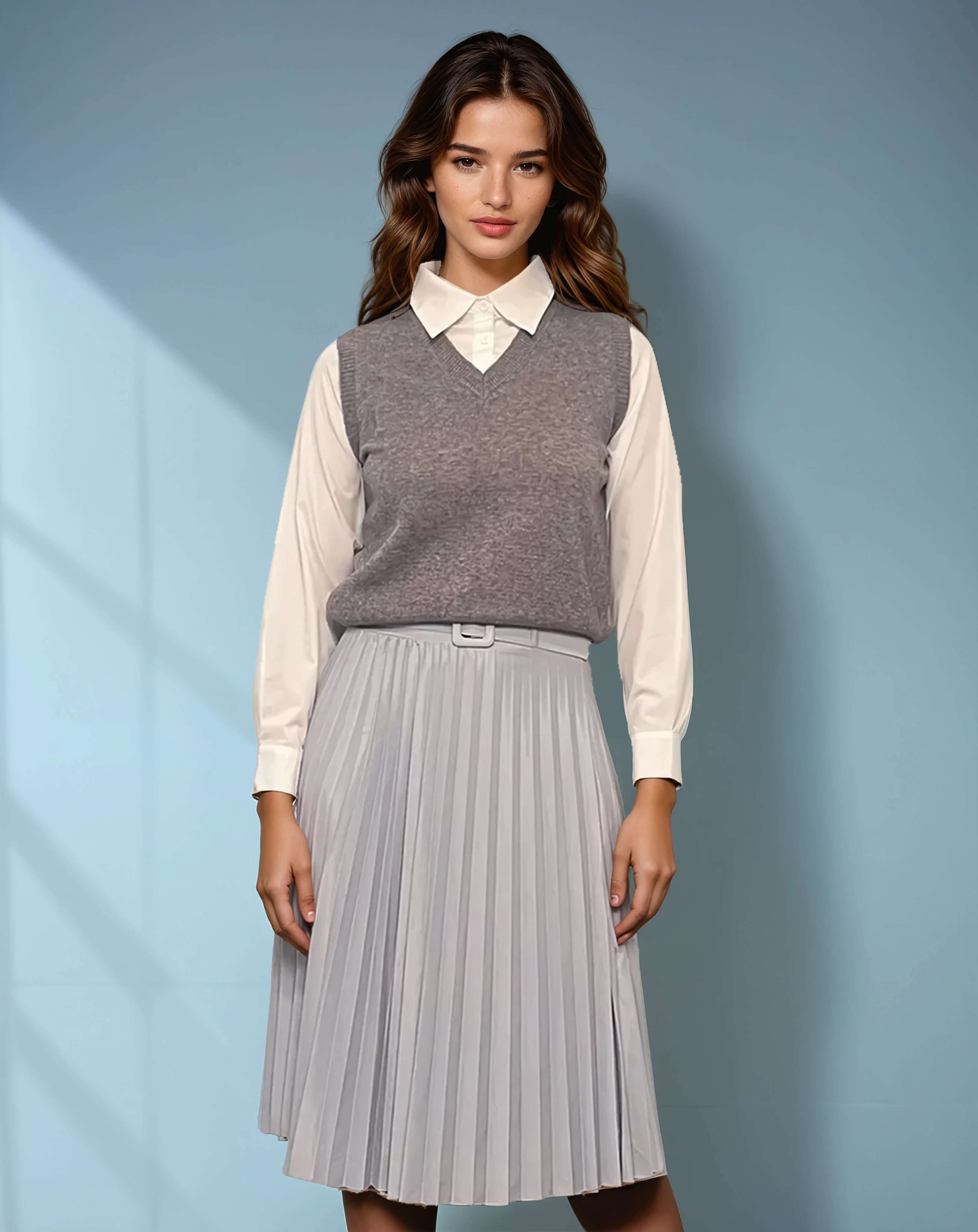 Vestă cu mâneci și guler cămașă gri este alegerea perfectă pentru un look sofisticat de birou. Griul neutru oferă versatilitate în asortare, iar textura moale transformă această vestă într-o piesă comodă și stilată.