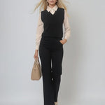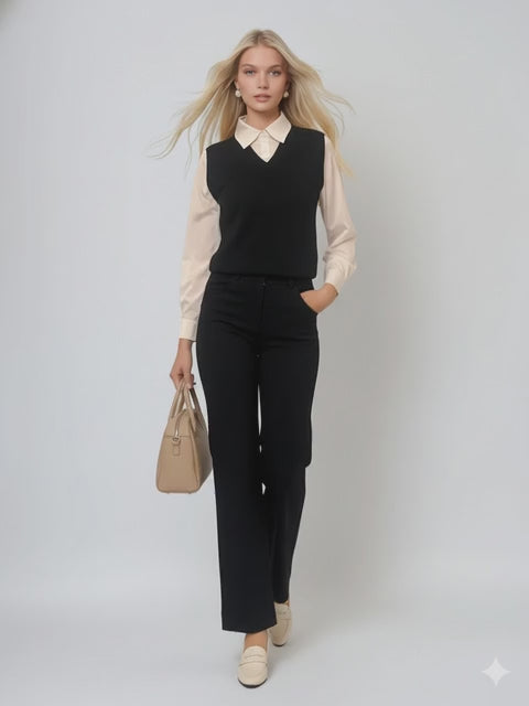 Vestă cu mâneci și guler cămașă negru este o piesă elegantă și versatilă, perfectă pentru ținute office sau evenimente formale. Croiala clasică este completată de gulerul cămașă, oferind o notă de profesionalism și stil.